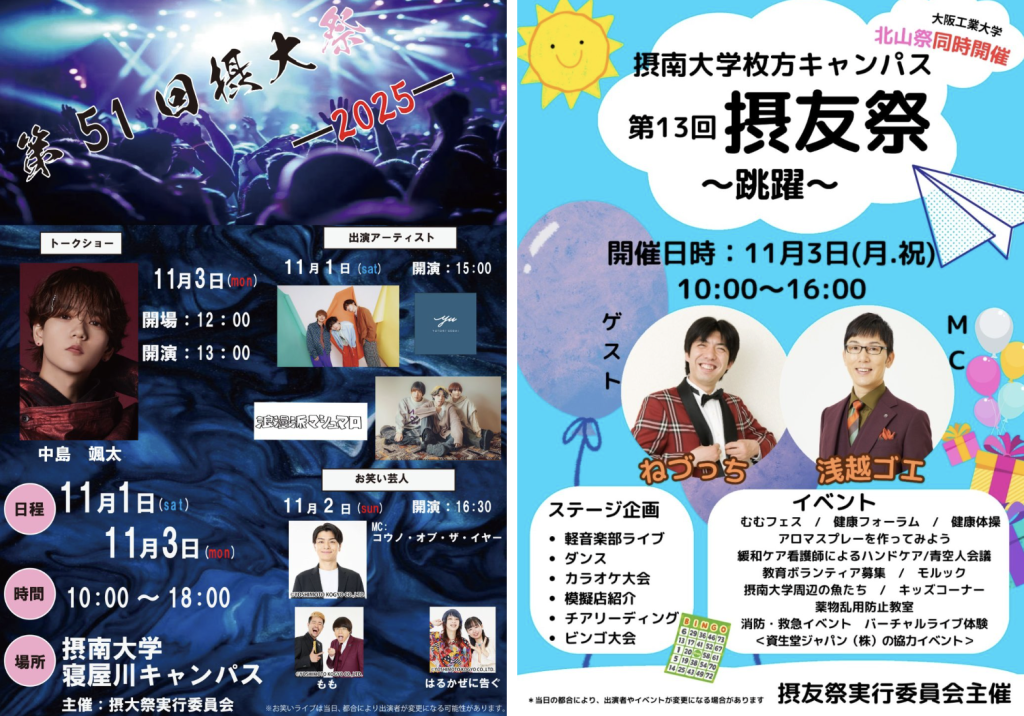 2025/11/1(土)〜3(月・祝)の3日間は、寝屋川キャンパスにて「摂大祭」を開催!