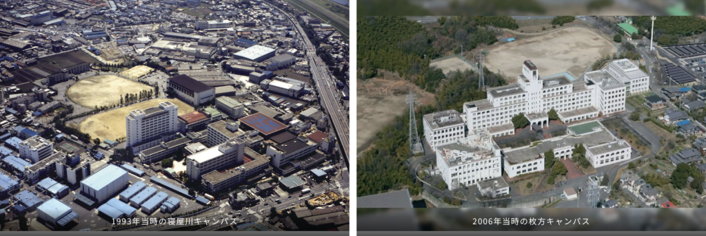 開学当初は寝屋川に工学部のみの単科大学としてスタートしましたが、時代の変化に合わせて規模を拡大し、1983年には枚方にもキャンパスを開設しました。