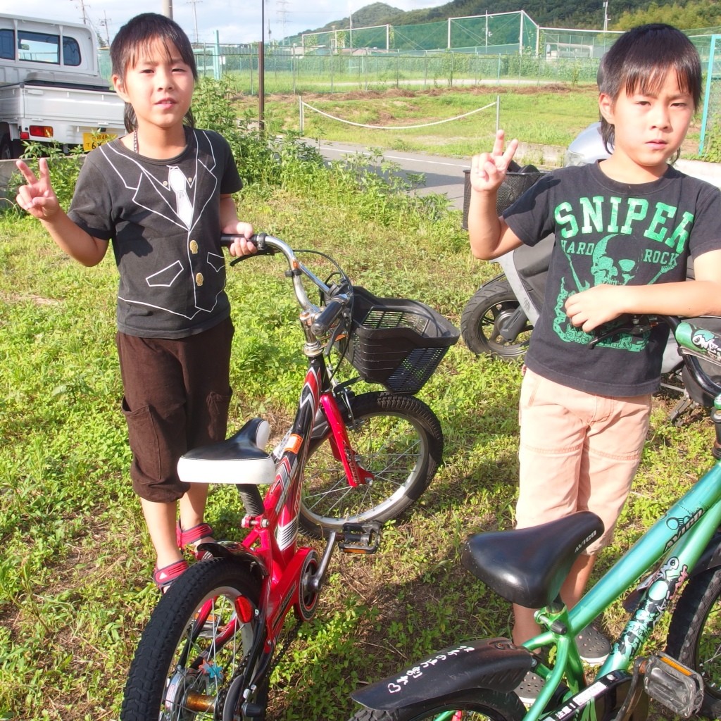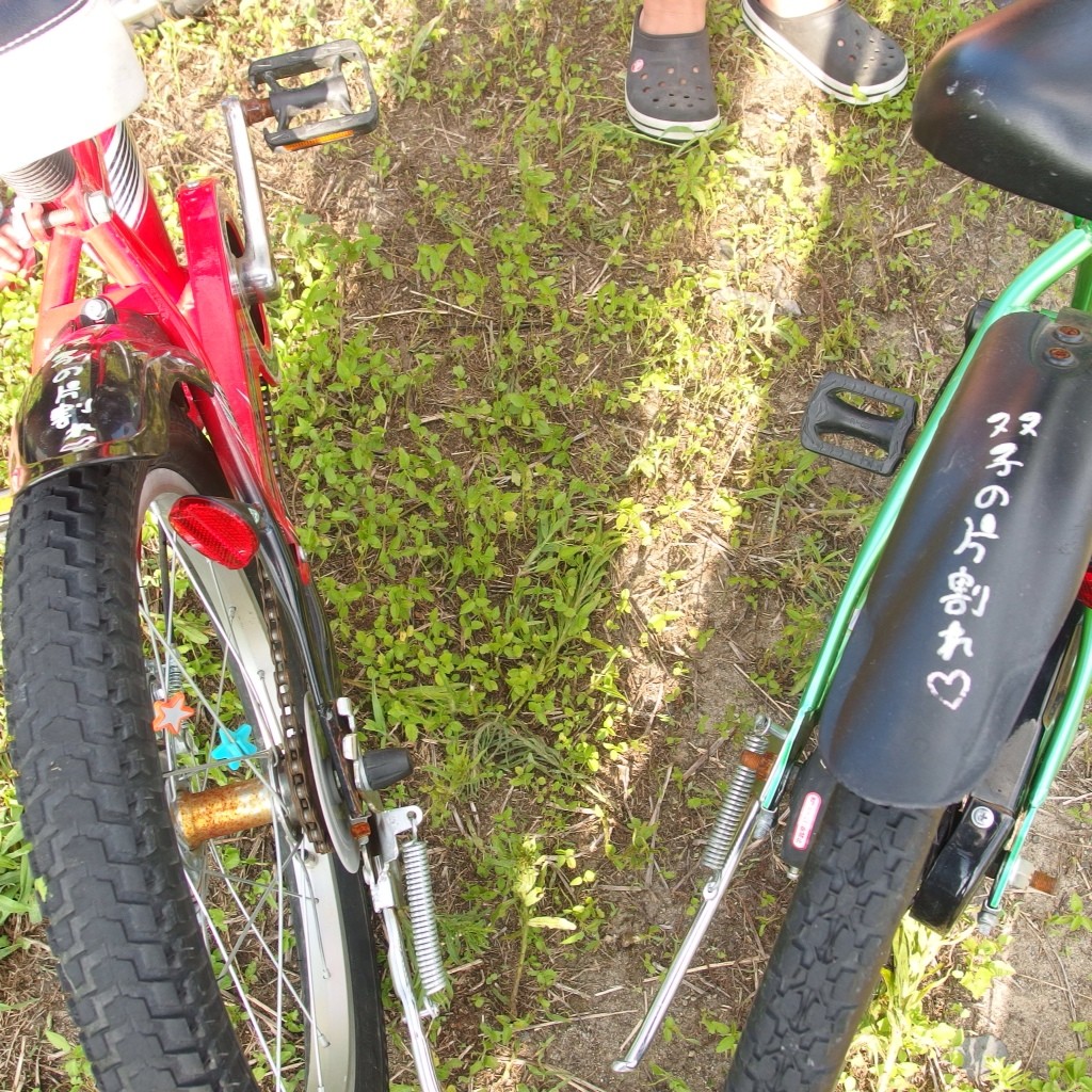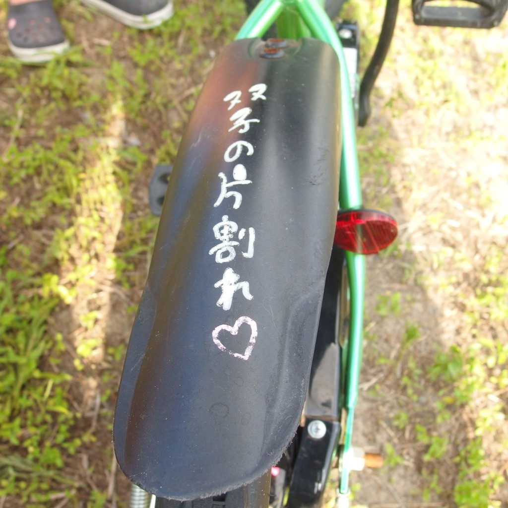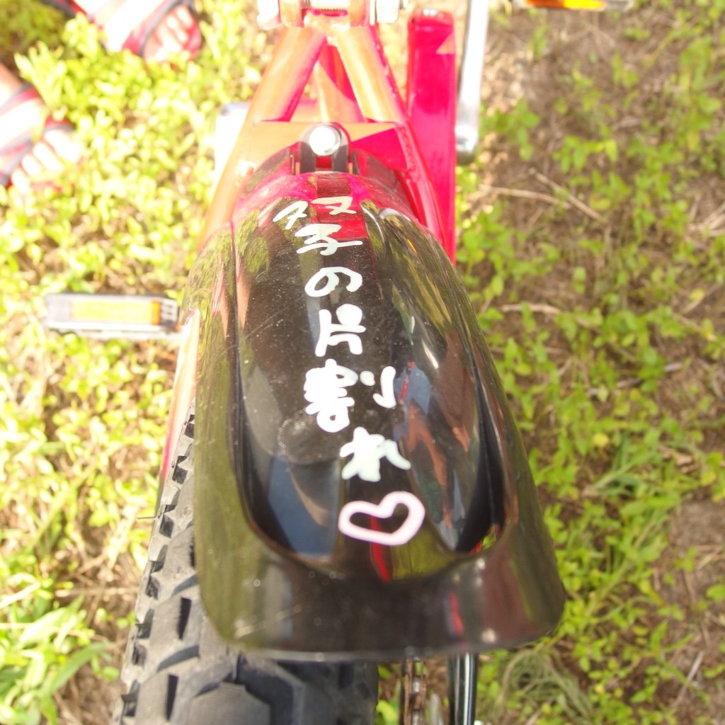 赤と緑のおそろいのマウンテンバイクなのですが、泥よけのところに、