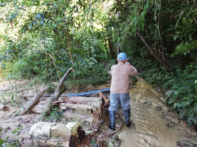 どうやら、この大量の水。池の水が溢れたものではなく、さっき観に行った池よりももっと山の上のほうが、土砂崩れしたのが原因とのこと。