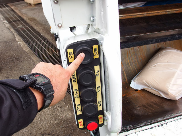 ここでは、実際にゴミ収集車にゴミを入れる体験ができるというので、