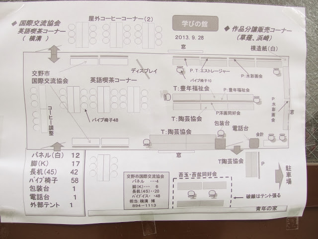 ここで、交野市国際交流協会さんが交流喫茶を出店され、おいしいコーヒーを振舞ってくれます。また、活動紹介の一環として、外国人の講師の方や、先日実施されたクッキングイベントに参加された関西外国語大学の留学生も来られて、市民と外国人の方々との交流の場が出現するようです。