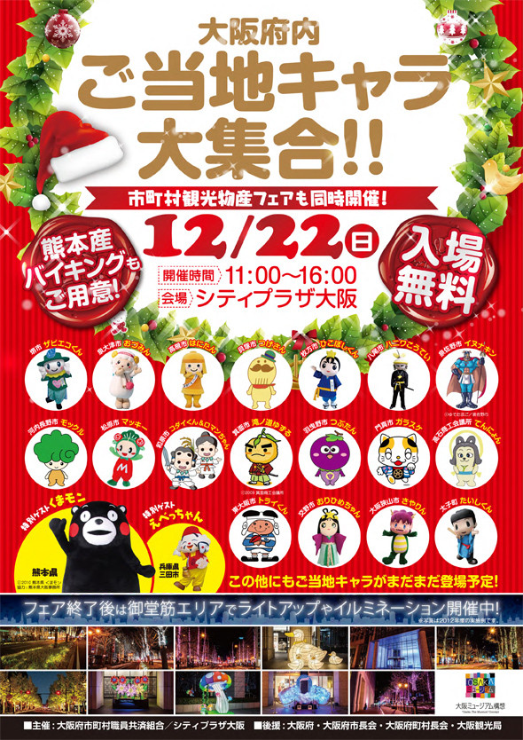 くまモン、えべっちゃんをはじめ、大阪府内のご当地キャラが大集合するイベントが、12/22(日)大阪市内のシティプラザ大阪でありますよ!