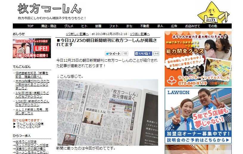 という見出しで、隣町枚方市の日本No.1地域ローカルweb siteの枚方つーしんさんの紹介記事です。