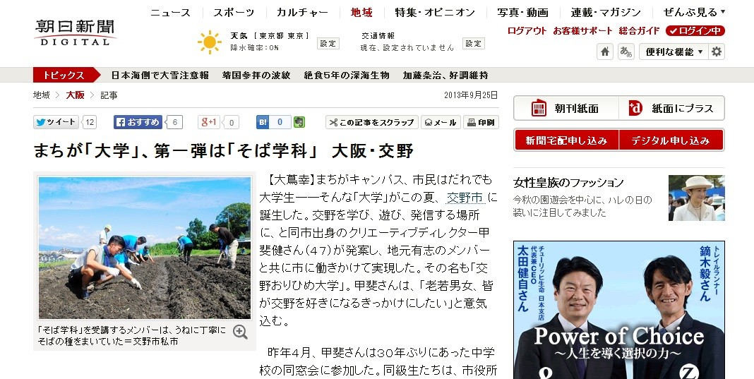 担当記者さんは、北河内エリアを担当されている、敏腕若手女性記者(美人です!)でして、交野市関係の取材であれば、交野市に今年8月にできた町全部が大学な市民大学の「交野おりひめ大学」や私市にあるセンス・オブ・ワンダーな施設「わくわく科学館」なんかの記事も担当されていました。
