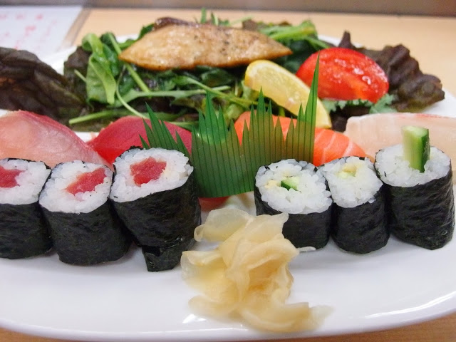 交野の葉物と焼魚のバルサミコ風、にぎりと巻き寿司付き