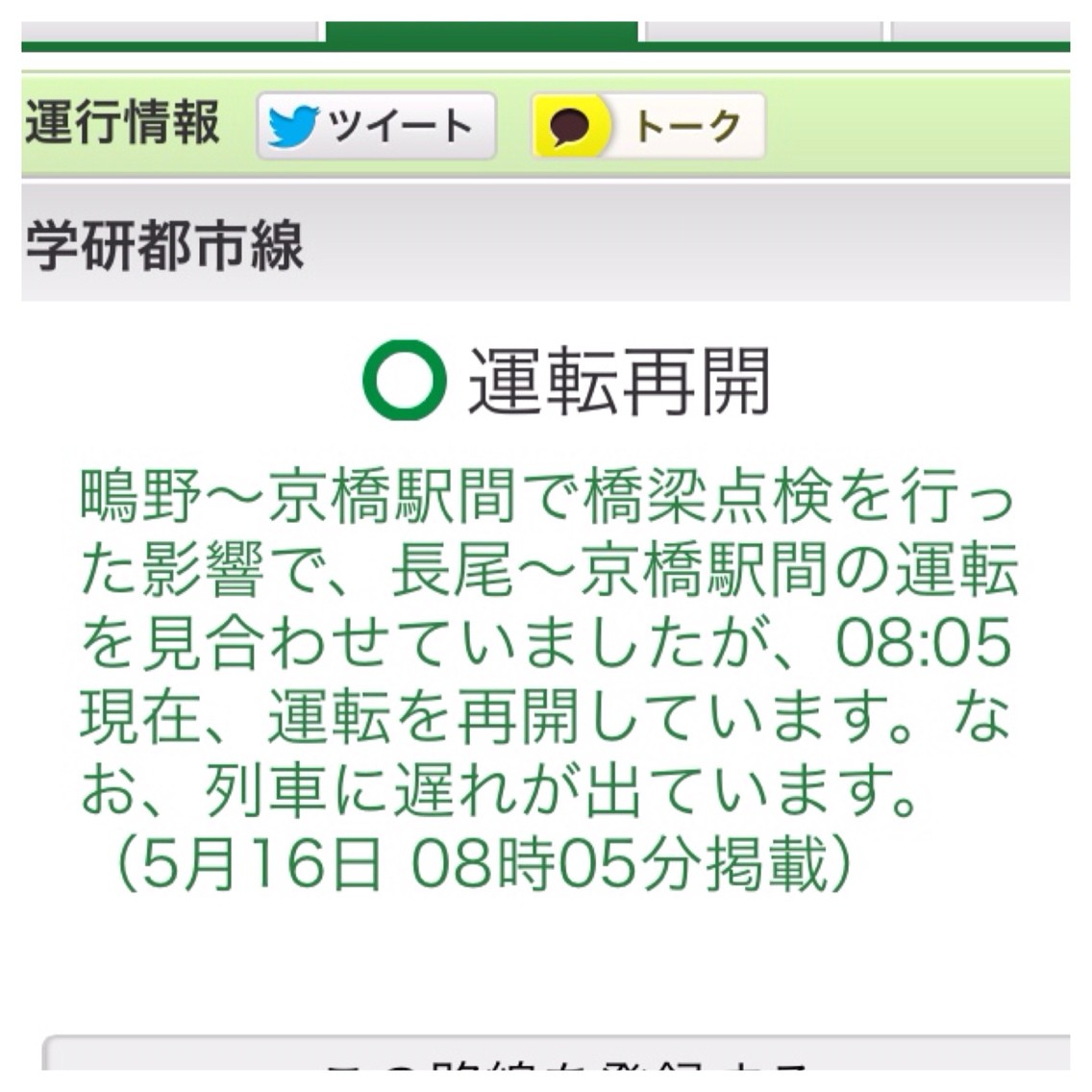 07:47頃、鴫野~京橋駅間で橋梁点検を行っている影響で、長尾~京橋駅間の運転を見合わせています。