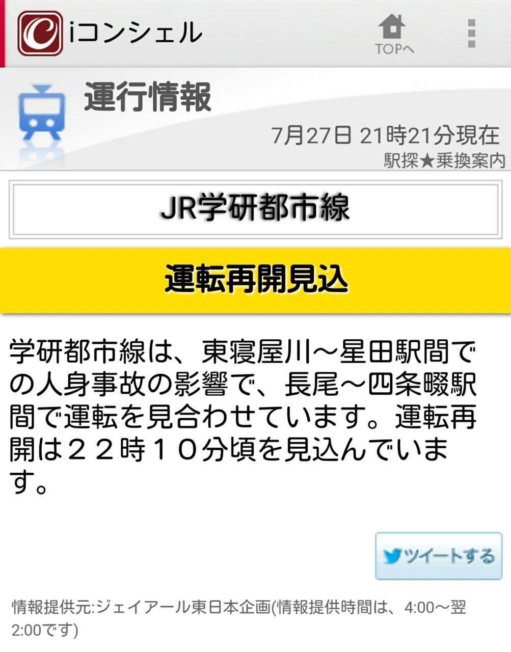 7/27PM9時半時点。学研都市線『東寝屋川駅~星田駅』間で発生した人身事故のため、長尾駅~四条畷駅間で運転を見合わせ中