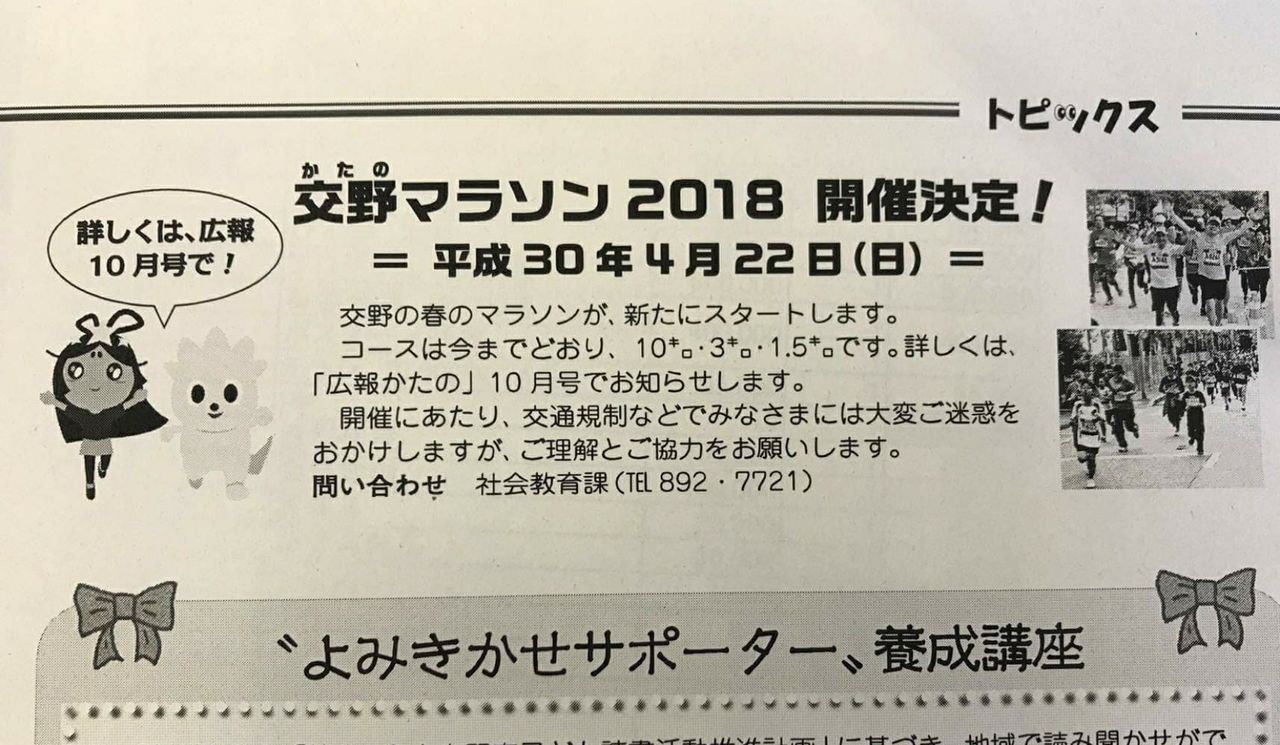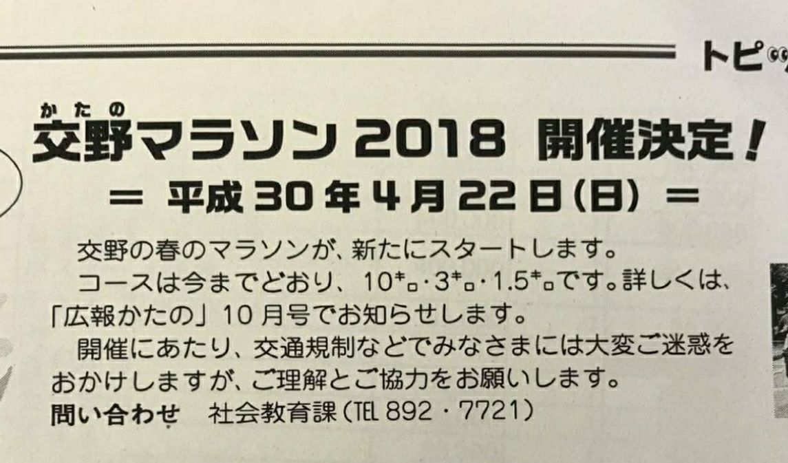 〜〜今後は、交野市体育協会がこれまでの大会で得たノウハウを活かしながら、市民マラソンなど新たな取り組みを企画される意向ですので、交野市としても必要な支援をしていきたいと考えています。とのことで、今まで開催されていた交野マラソンと全く同じ企画が2018年の交野マラソンに当てはまるというわけではなく、新しく生まれ変わる(Reborn:リボーン)がテーマとなった新しい交野マラソンが開催される予定のようです。