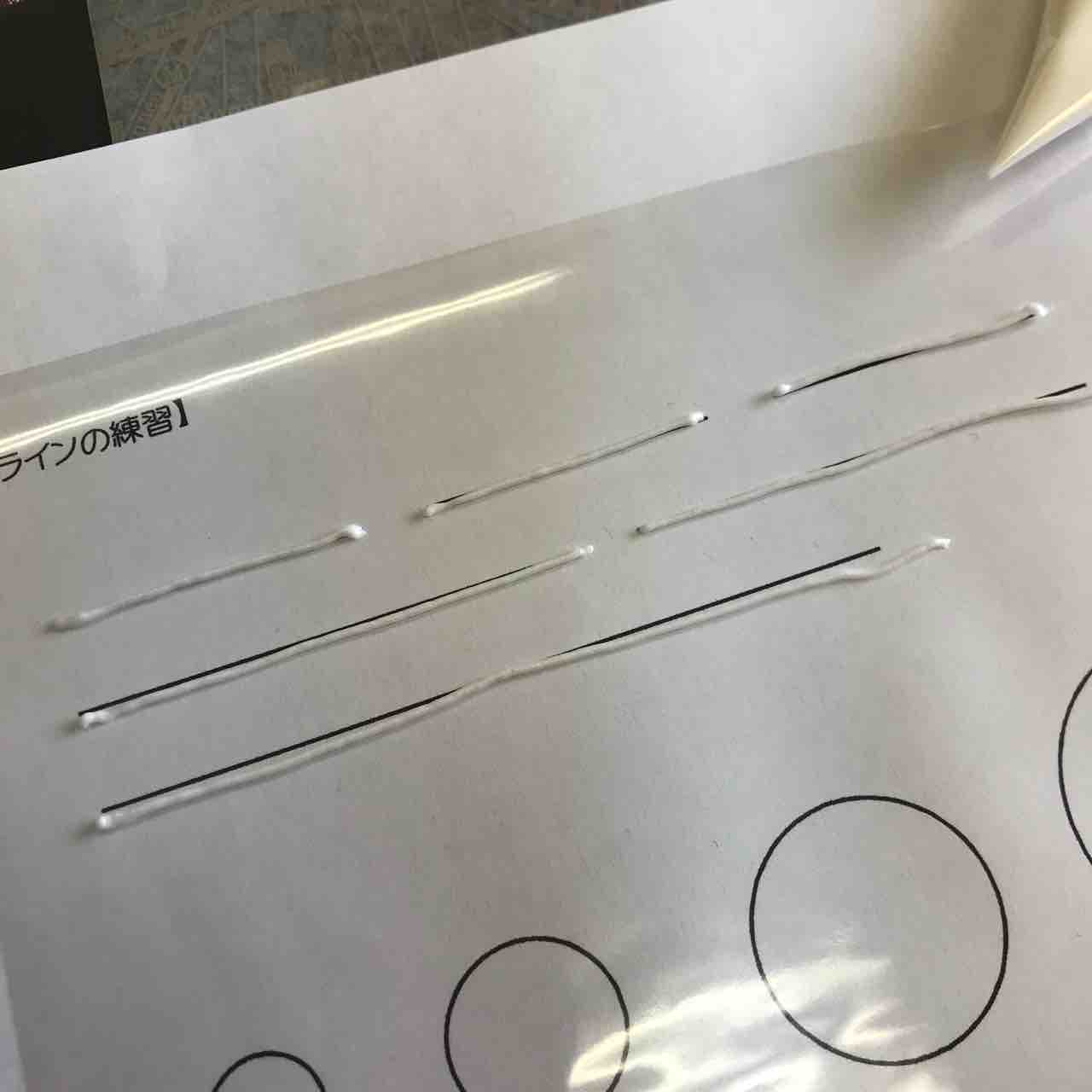 練習の線がプリントされた用紙の上の
