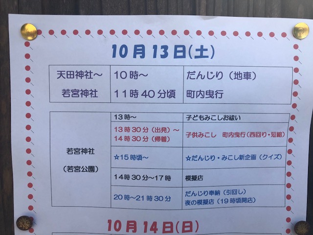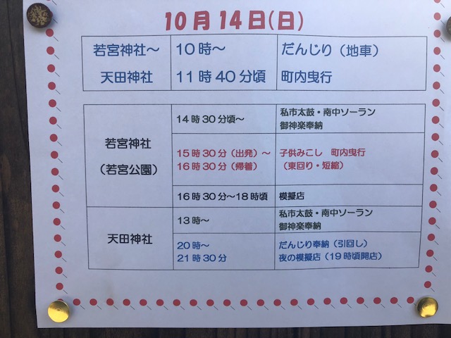 後編の配信はきっと月曜日とかになってしまいそうなので、14日(日)の私市秋祭りのスケジュールを下記お伝えさせていただきます。