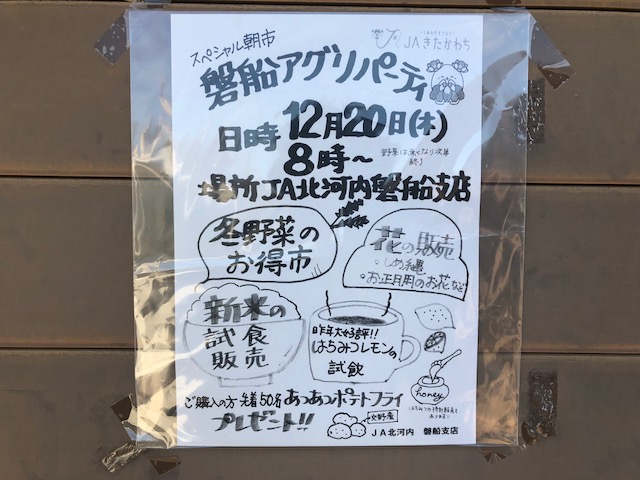パーティーは12月20日(木)の午前8時からJA北河内磐船視点で開催されるスペシャル朝市のようです。