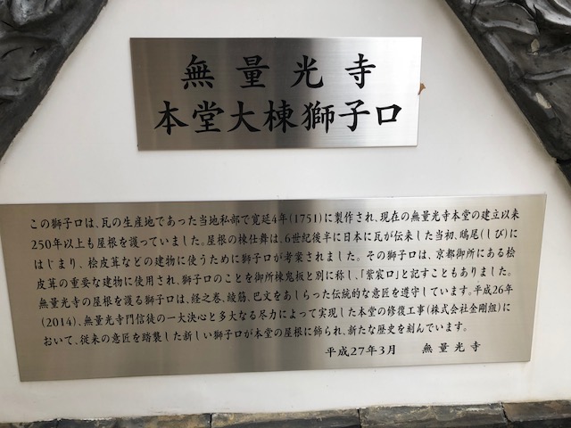 この獅子口は、瓦の産地であった当地私部で寛延4年(1751)に製作され、現在の無量光寺の建立以来250年以上も屋根を護っていました。