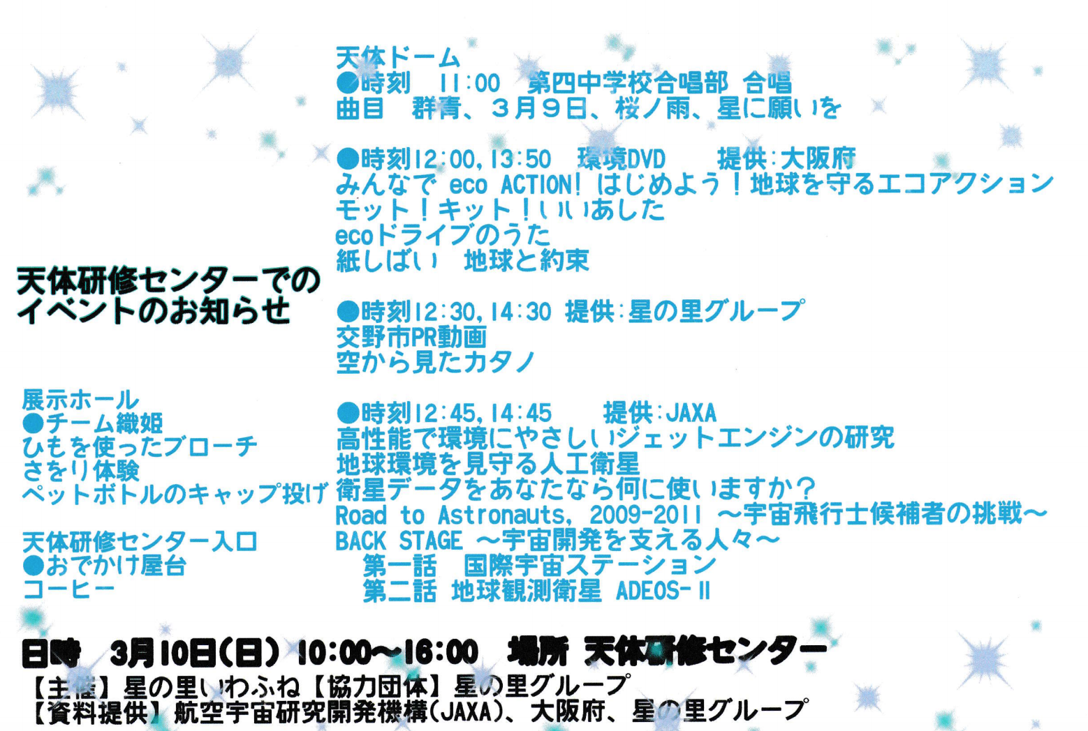 というわけで、3月10日(日)は交野市私市にある星の里いわふねと天体研修センターに行くと楽しいと思うのでぜひぜひ。