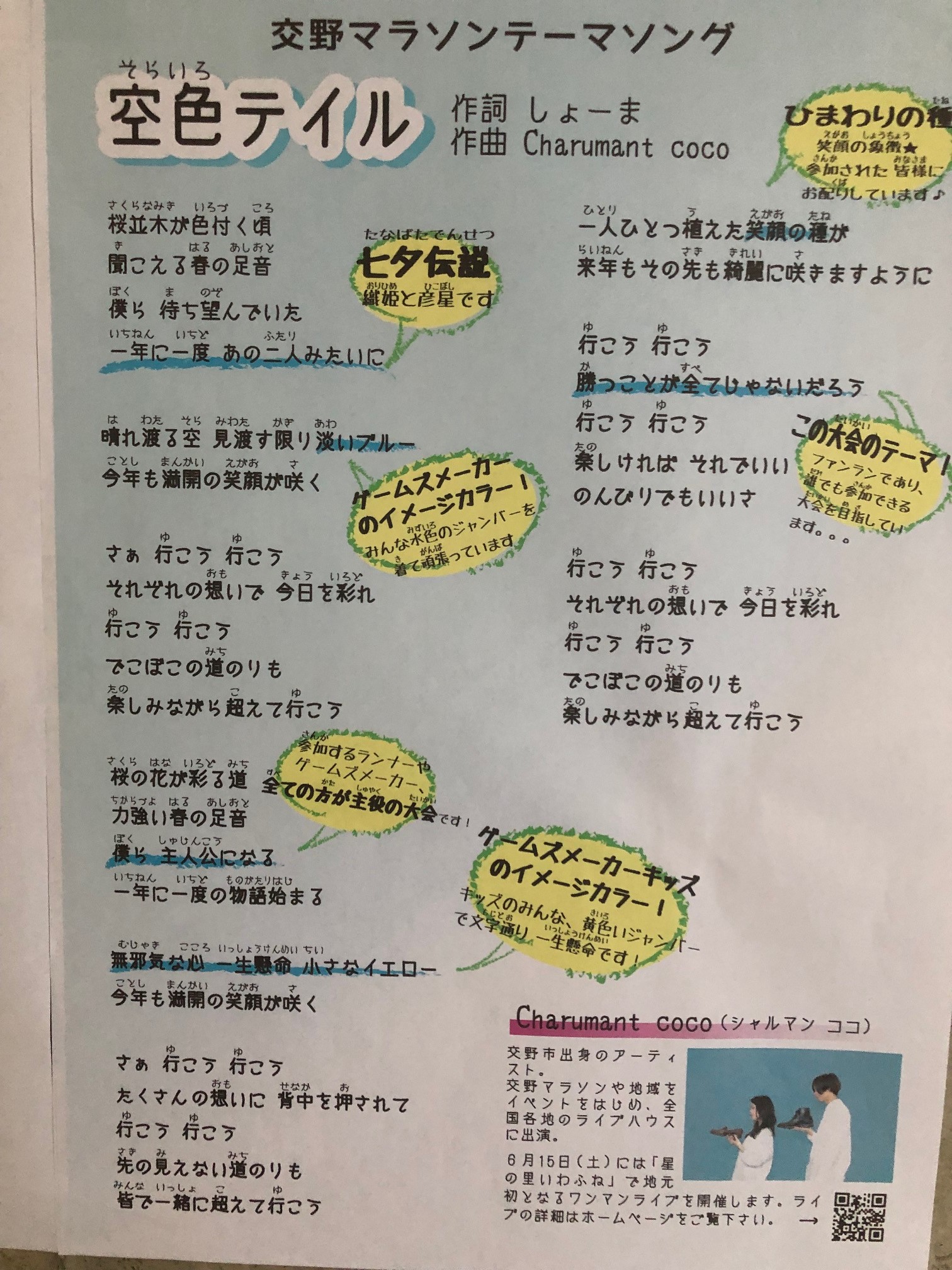 そして歌詞の所々に交野のこと、交野マラソンのことを表現しているポイントがあってそこにシャルココさんコメントが黄色で補足されています。