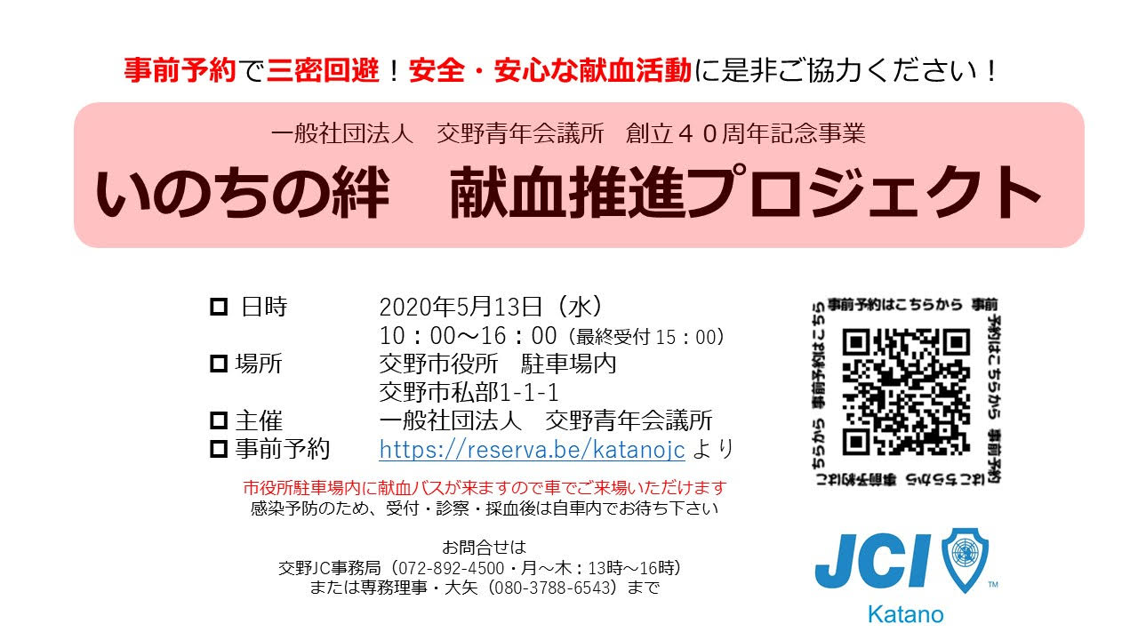 交野青年会議所が献血の協力依頼&5月13日(水)に交野市役所駐車場で献血