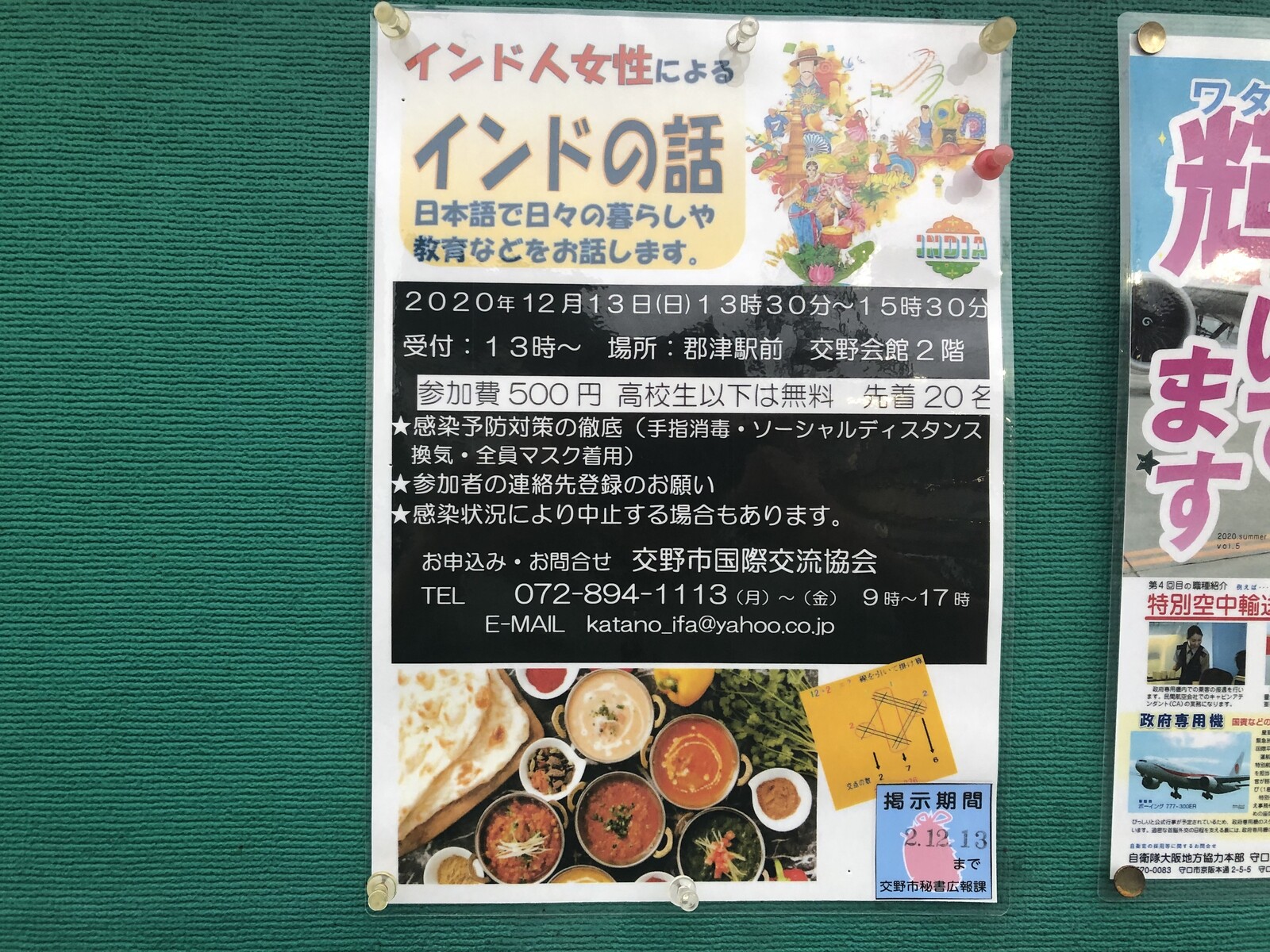 交野市国際交流協会さん主催で12月13日(日)13時半から京阪電車の郡津駅前の交野会館2階でインド人女性によるインドの話っていうのが開催されるようだ!