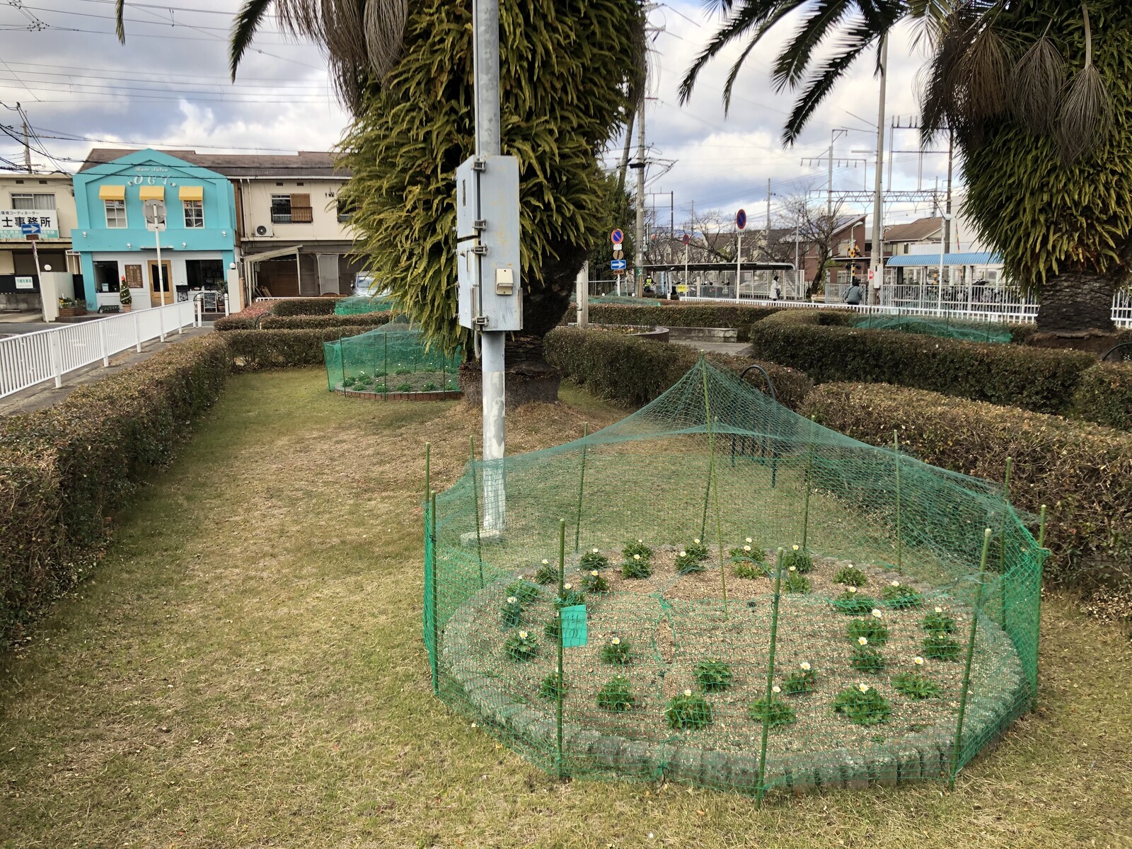 郡津駅、交野会館前の植え込みのところ