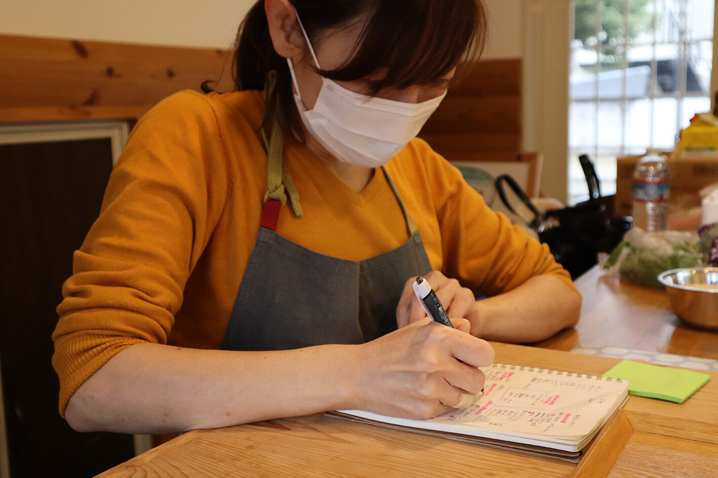 手前、レシピごとにメモとり、段取りばっちり久保さん。