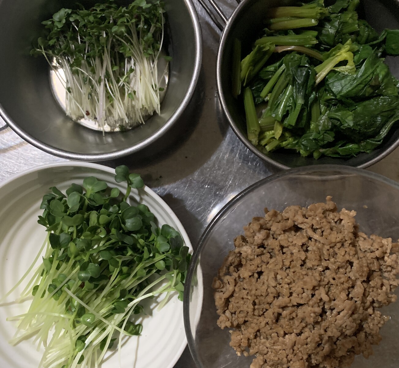 ひき肉と豆苗〜〜