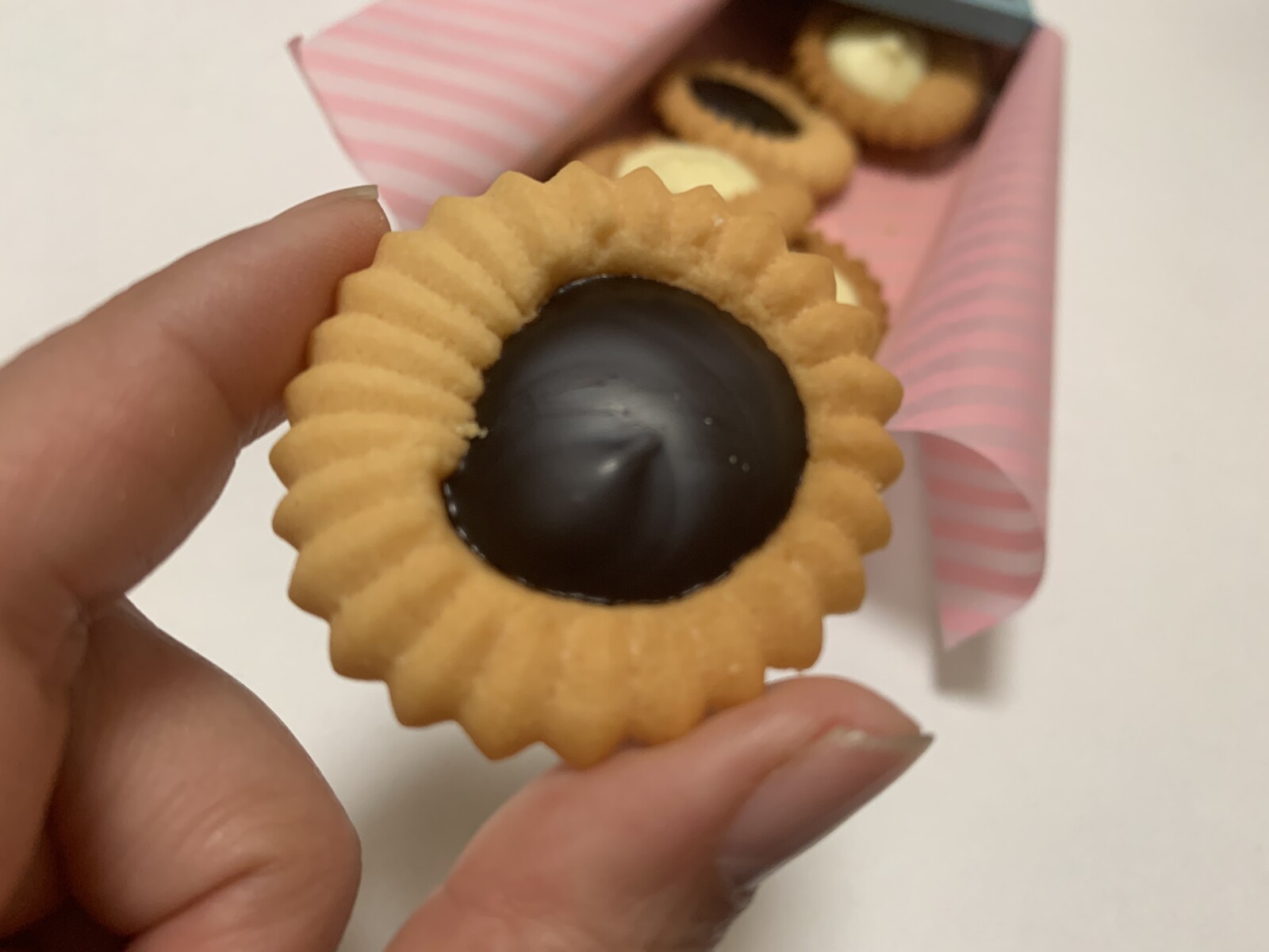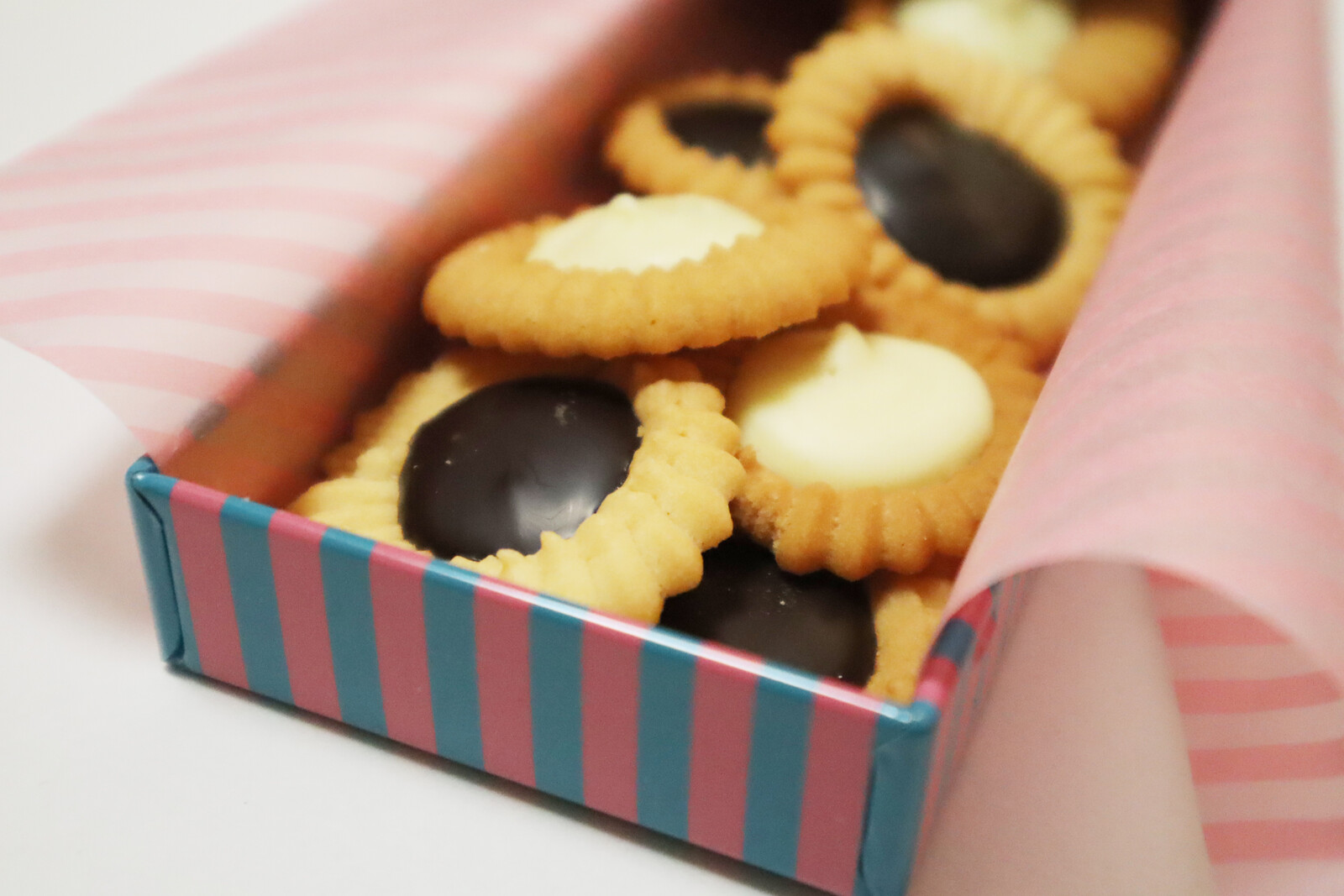 可愛い缶に、ビターチョコレートとホワイトチョコレートを使ったロミアスクッキーを入れました。(ビター5枚、ホワイト5枚入り)サクッとしたクッキー生地は発酵バターを使用しており、コクと香りがたっぷりです。真ん中に流したチョコレートとの相性も良く、寒い時期の珈琲や紅茶のおともにぴったりです。〜一天さんのSNSより〜
