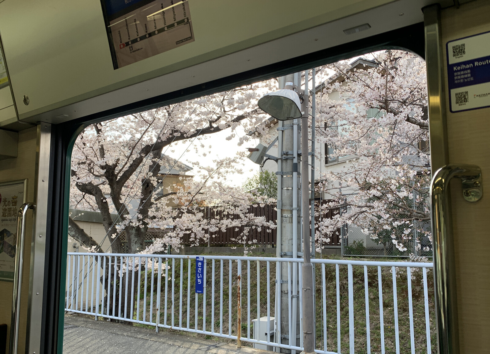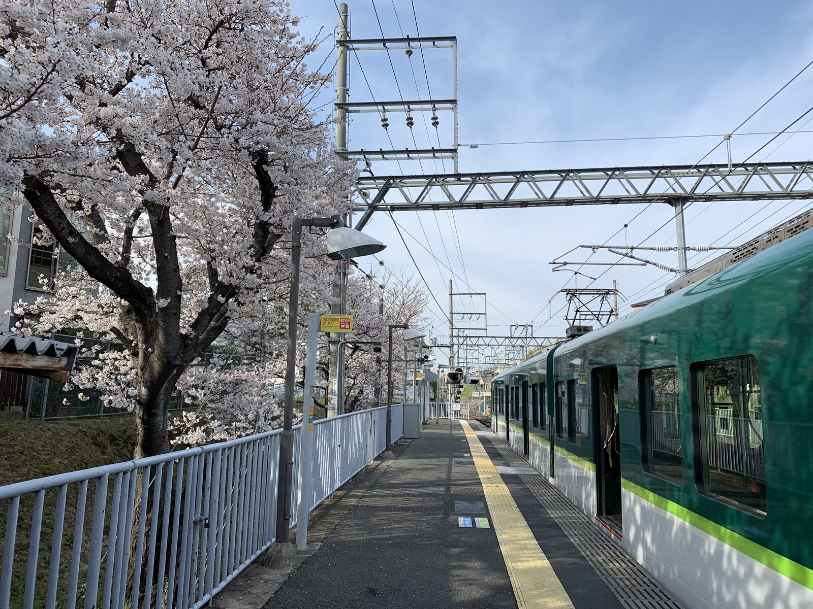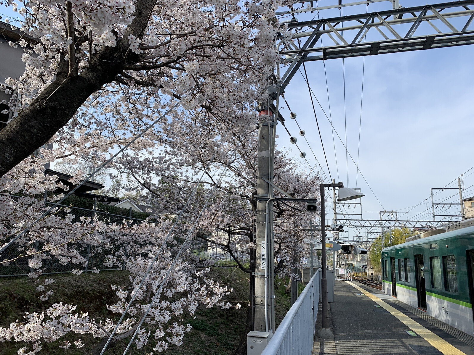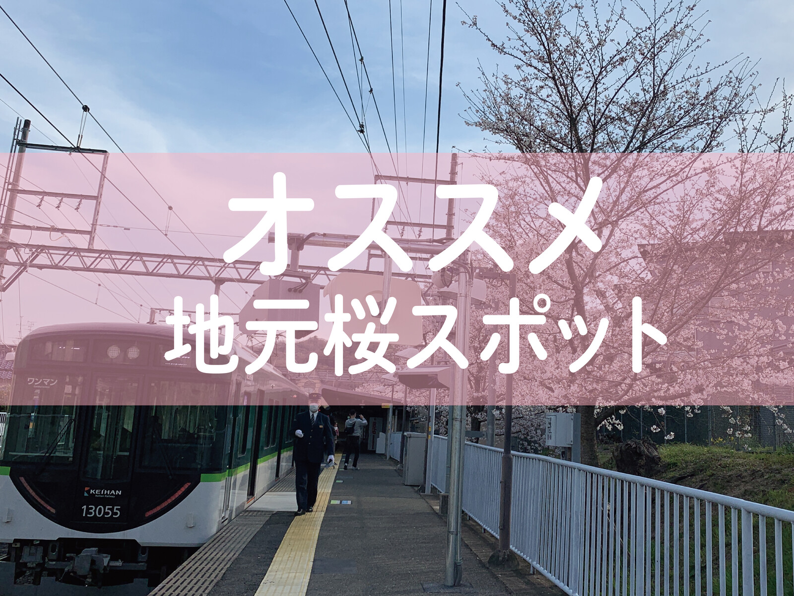 京阪電車私市駅ホーム近くの桜も満開。駅と電車と桜。〜交野タイムズがオススメする地元桜スポット~