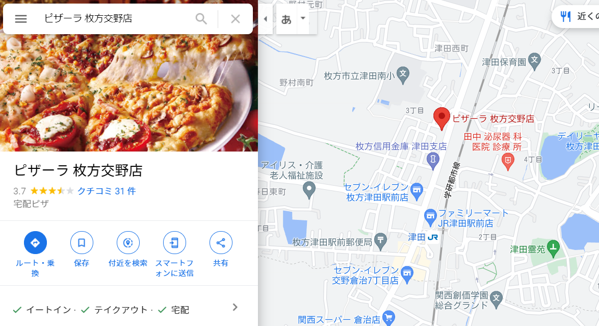 どっちなの~!と疑問に思ってしまう支店名ですが、津田駅周辺には「津田店」や「枚方津田店」や「倉治店」という支店名がほとんどで、交野と枚方が両方入っている支店名はピザーラ枚方交野店だけでした。