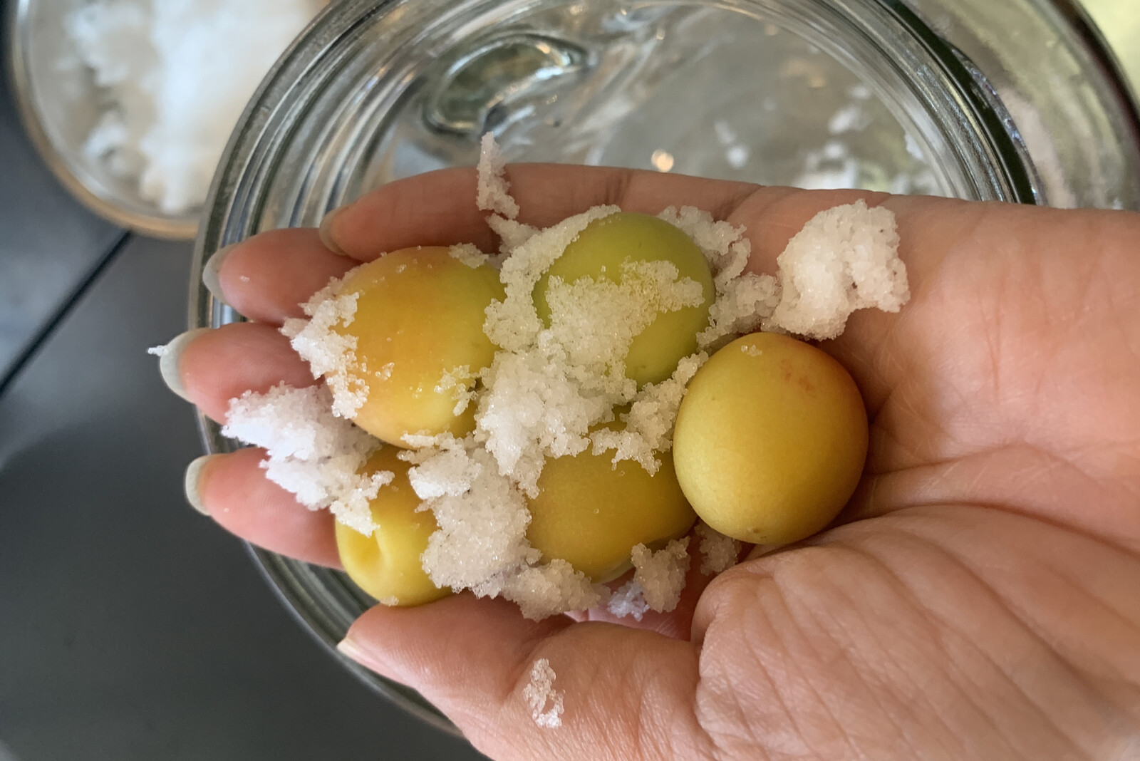 お塩を梅に刷り込みながら