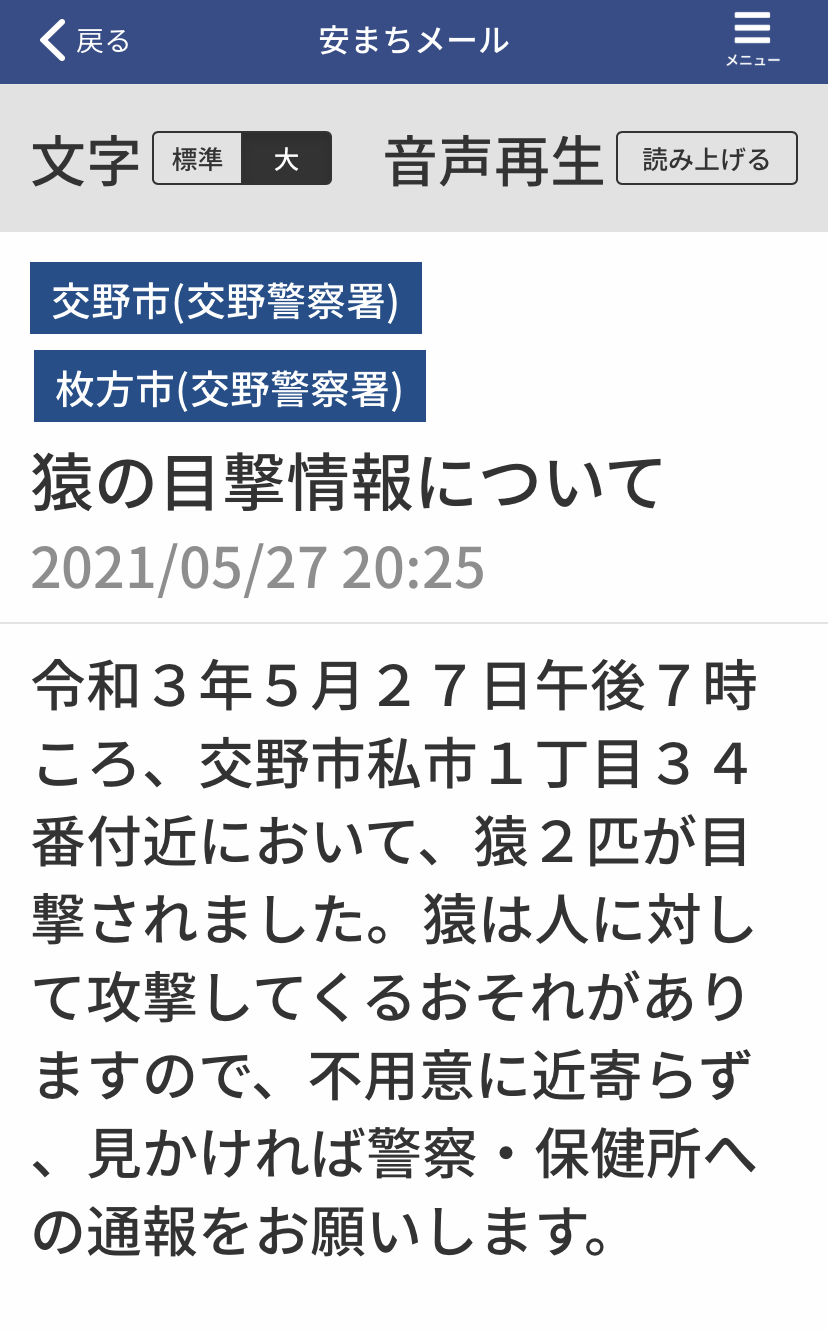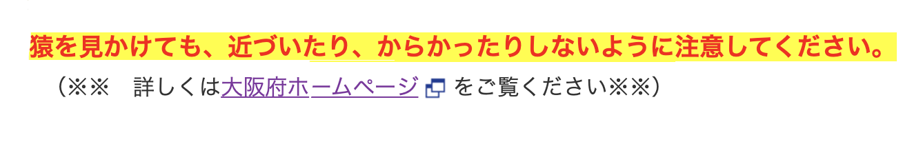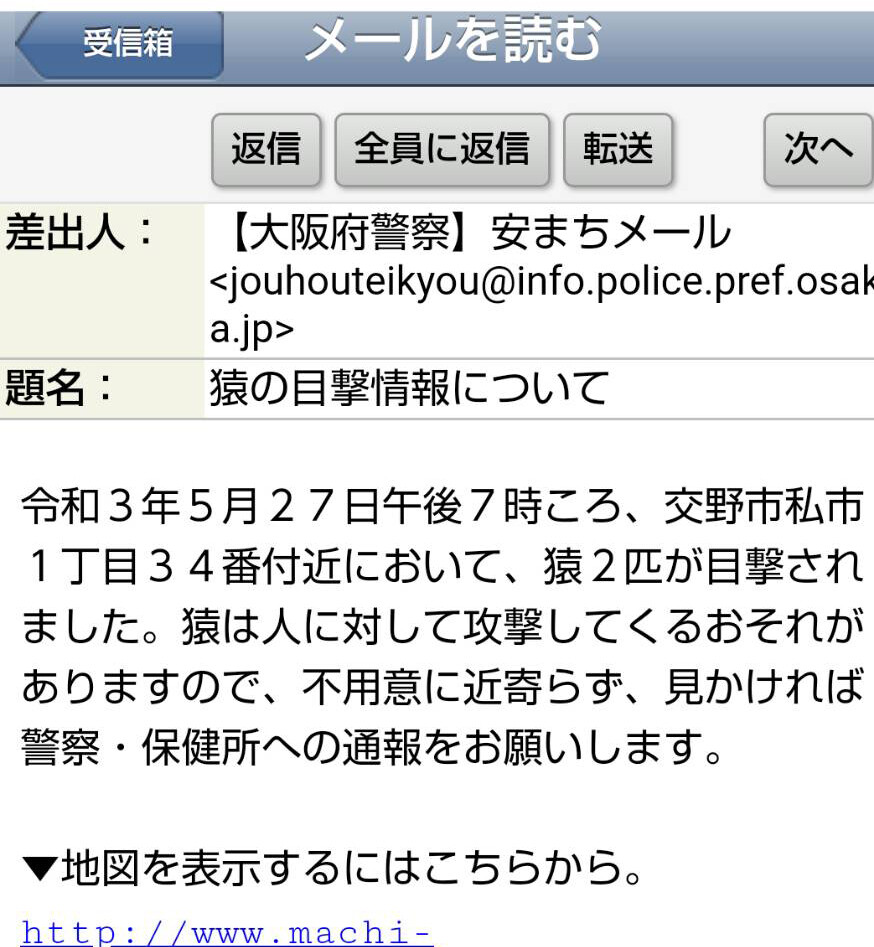 私市1丁目34番付近に猿が2匹出没したみたい!もし猿に会っても近づかないように。【情報提供:ゆかおさん】