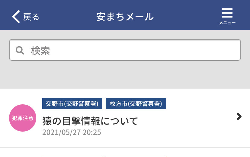 特殊詐欺情報、ひったくり、不審者子供に対する声かけ事案、などの「犯罪発生情報」、被害を防止するための「防犯対策情報」「防犯イベント」などを警察からメールでリアルタイムにお知らせする大阪府警からの情報提供サービスのことです。