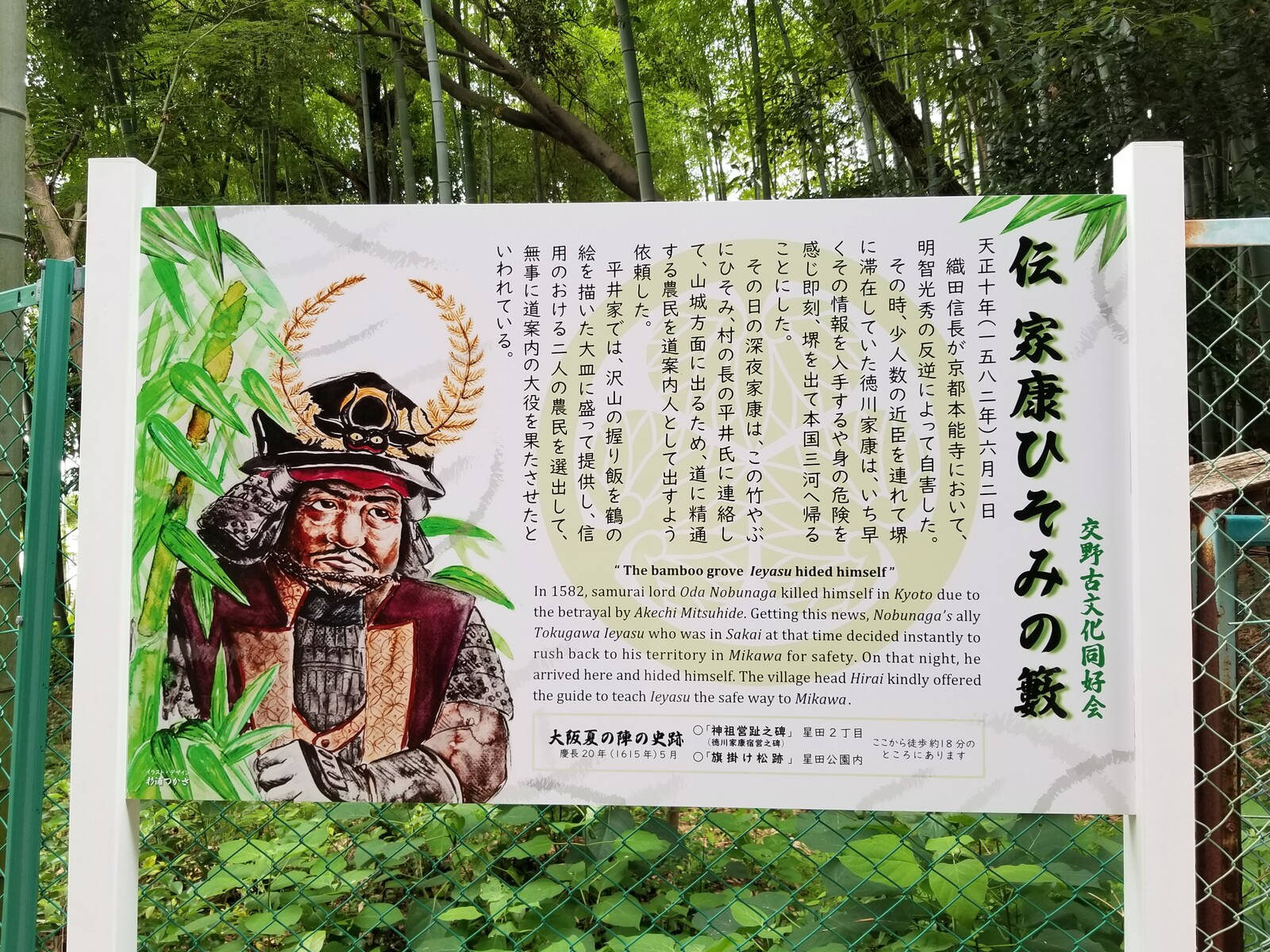 悔しそうな家康さんの表情も再現!?妙見坂小学校裏手の竹やぶにある『家康ひそみの藪』の看板が新しくなってる!