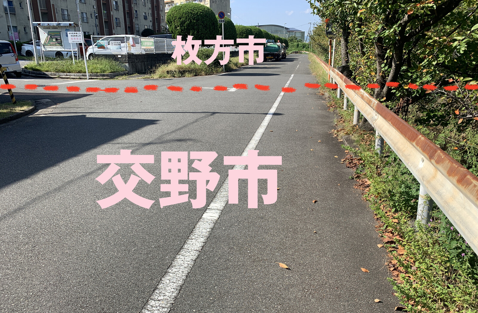 向こうは枚方市、こっちは交野市状態です。