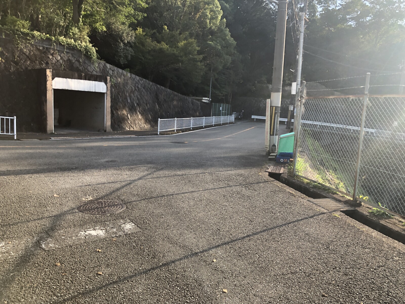 フェンスで囲われたコンクリート池(ほとんど水はありません)沿い、坂を登る途中にゴミステーションが1つあります。