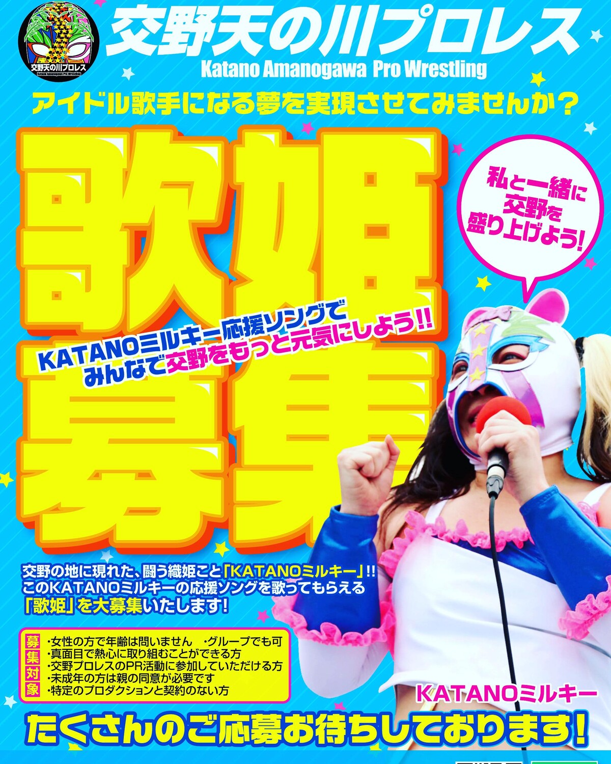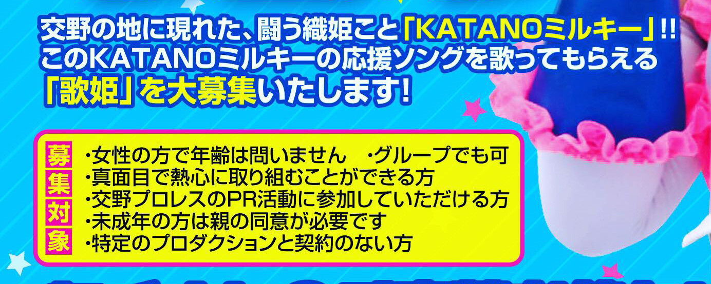 交野天の川プロレスが「KATANOミルキー」の応援ソングを歌ってもらえる「歌姫」を募集している!