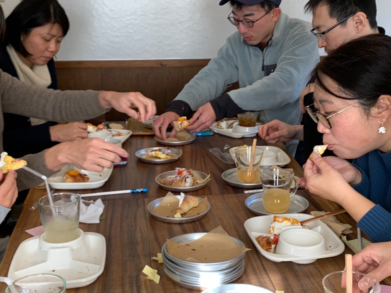 8等分にカットすれば、ひとりひと切れちょうど良かったのですが、さすがに8等分はボロボロになりそうとの判断で、4等分に。