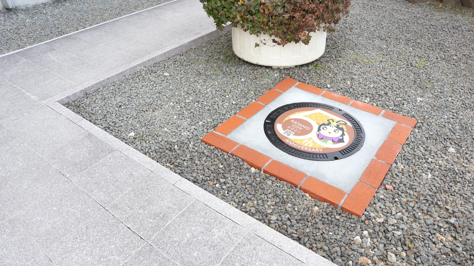 ここにあった!交野市役所本館前に市政50周年の記念マンホール第2弾が設置されてる!