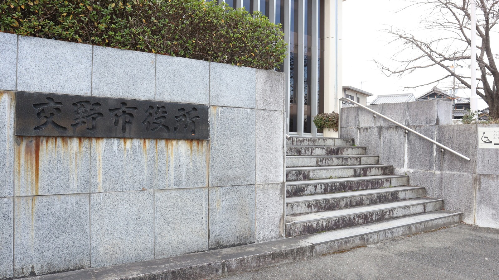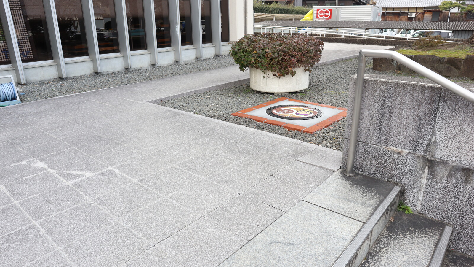 とざっくり周囲の様子などお伝えしましたところで、その市政50周年記念マンホールは、交野市役所本館のどのあたりにあるかと言いますと…