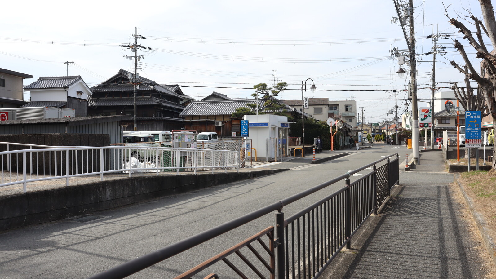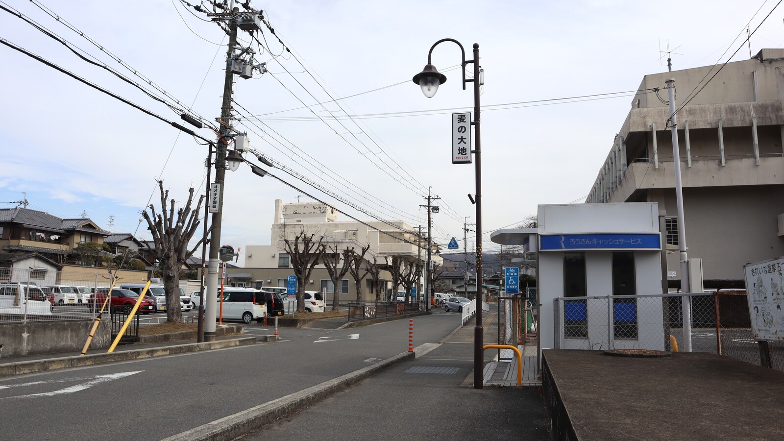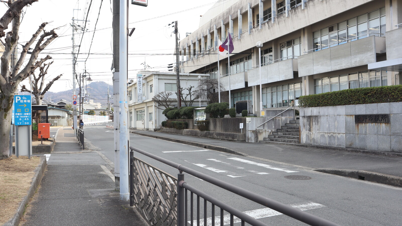 交野市役所本館前の道路をはさんで向こう側には駐車場があります