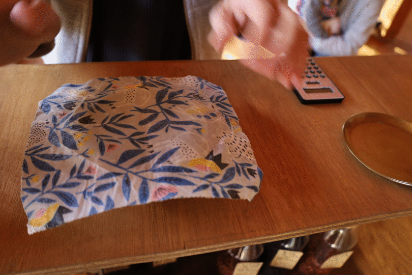 名前の通り布にみつろうを塗って耐水性などを向上させたエコラップで、サランラップは1回こっきりなんですが、このみつろうラップは繰り返し何度も使える地球に優しいグッズとなっています。
