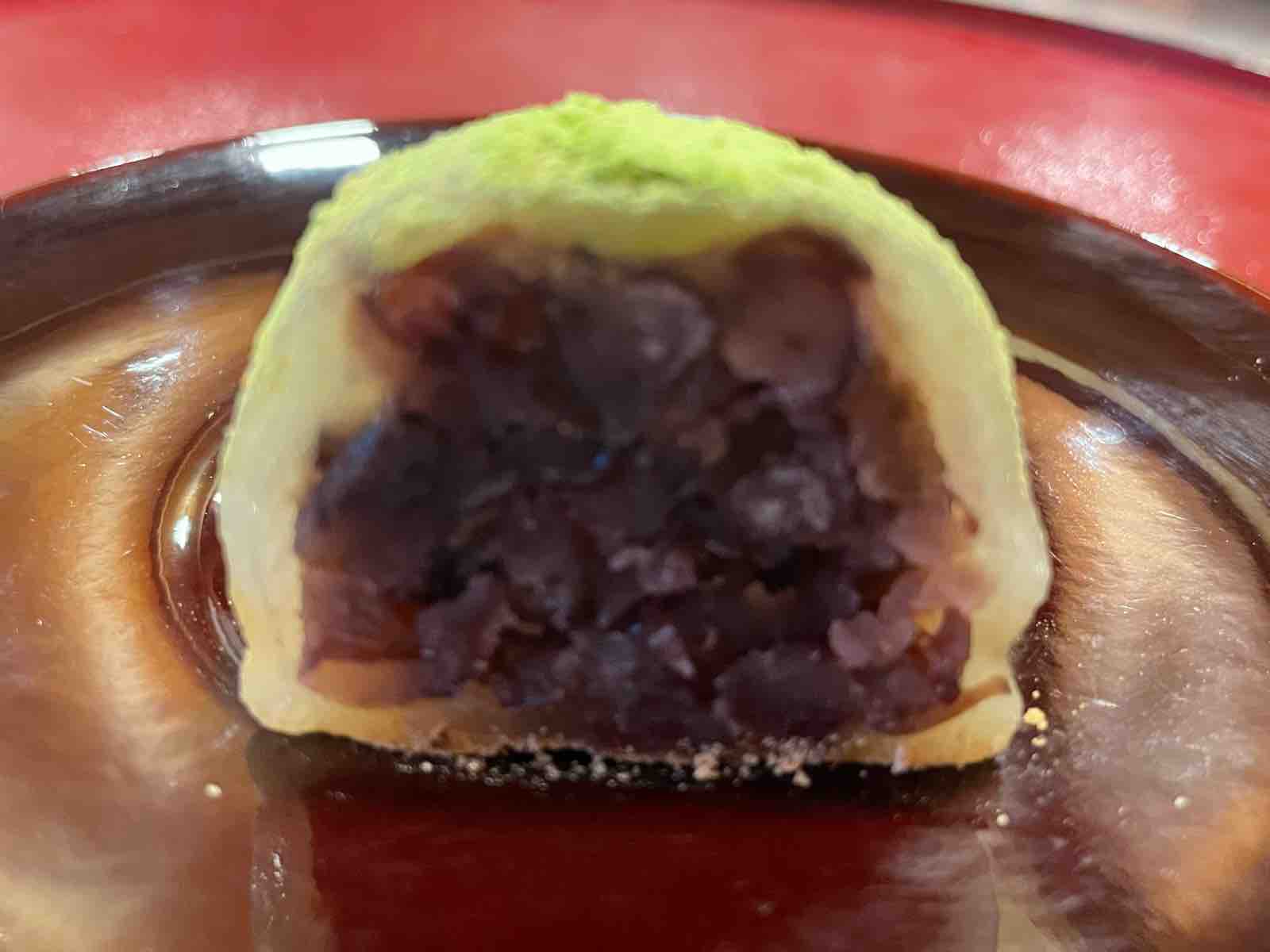 ぎっしりと粒あんが入っていて、周りの薄い皮は求肥ですね。