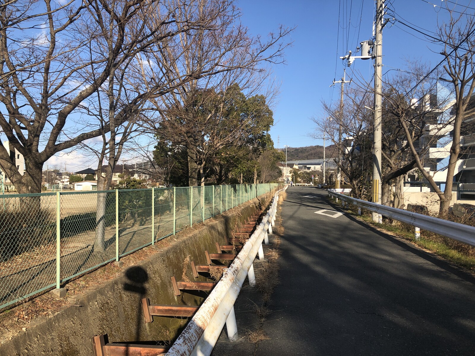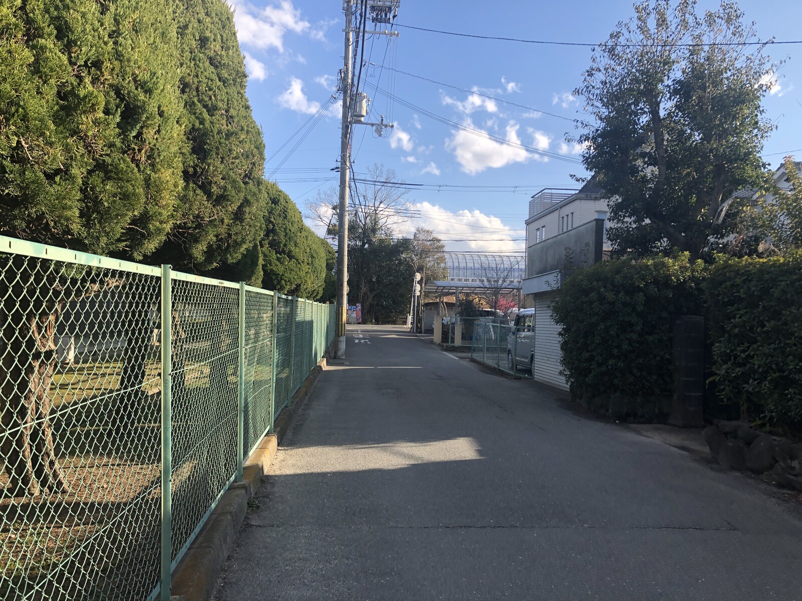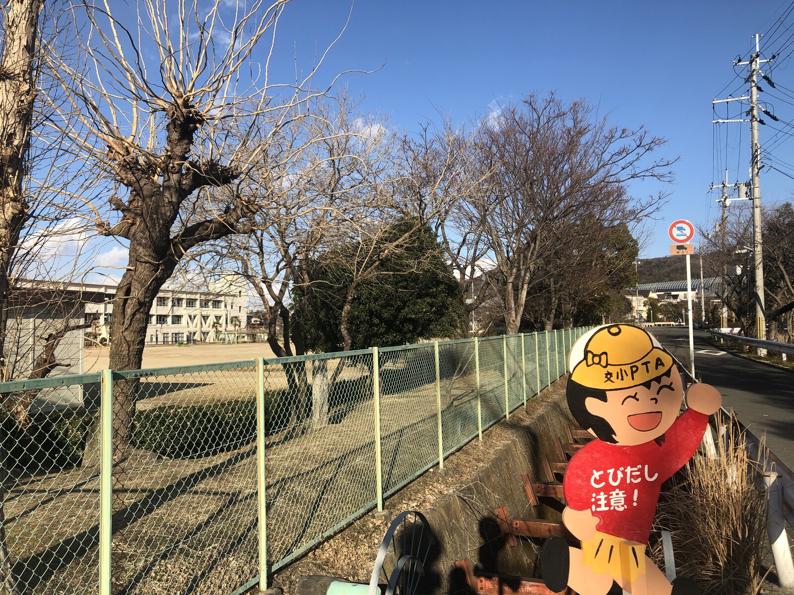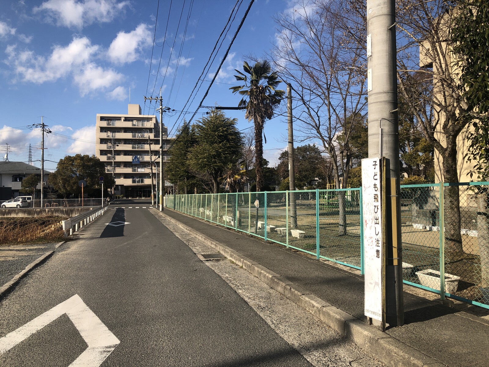 交野小学校の校門の前の道、私部保育園の近くの学校のフェンスのところ。