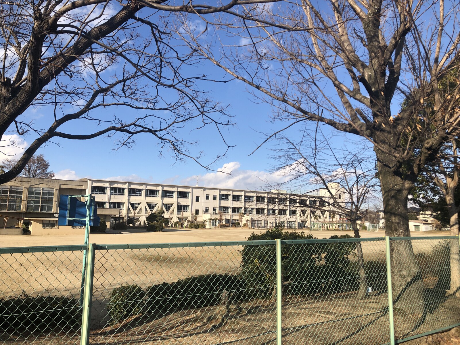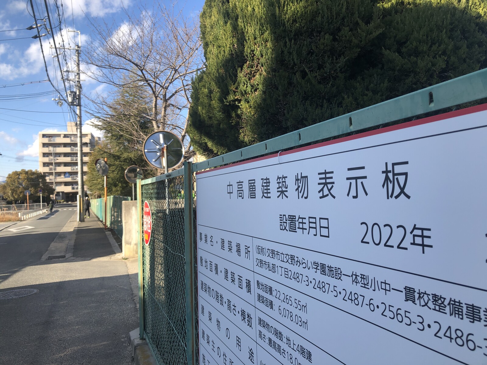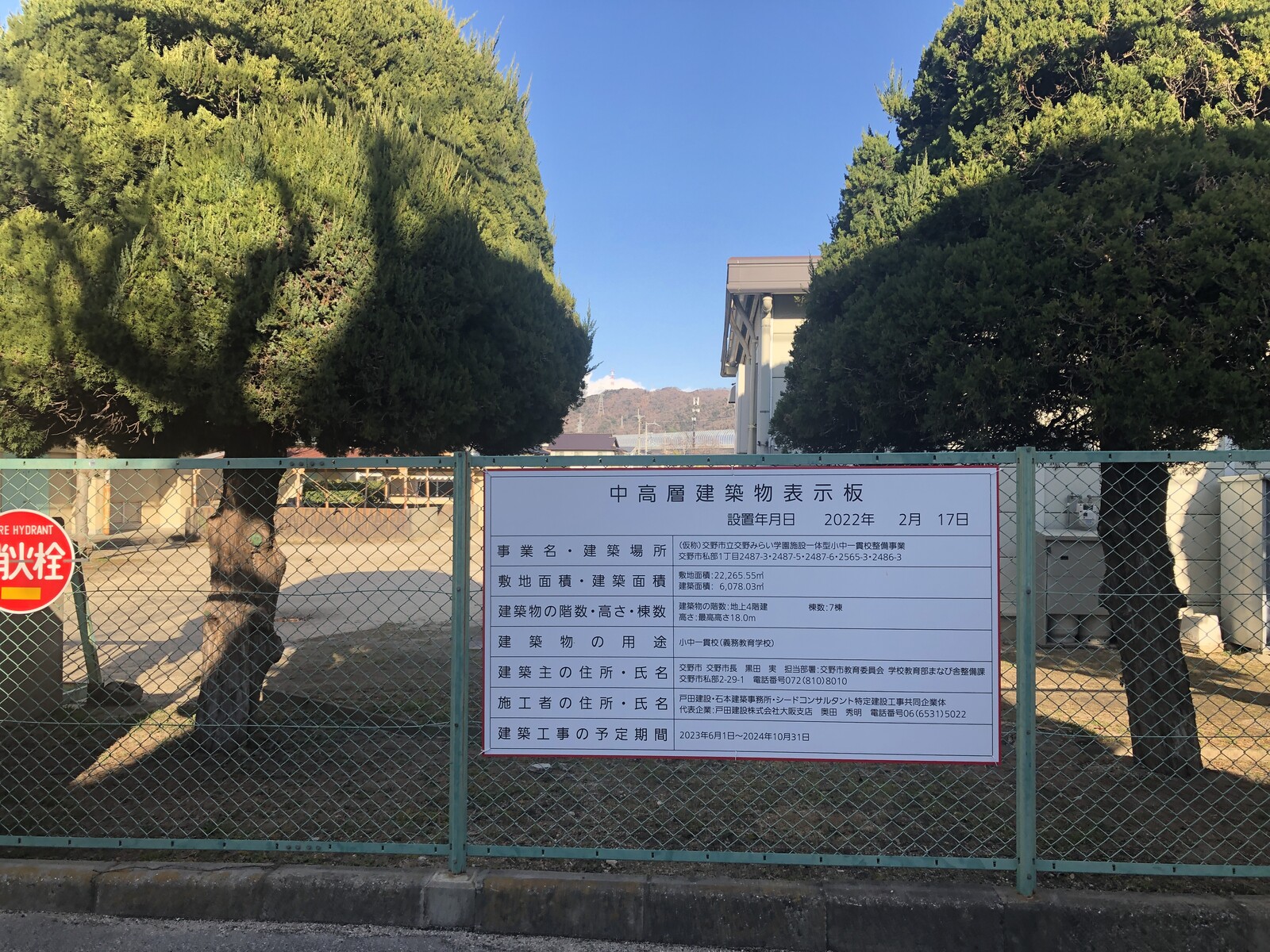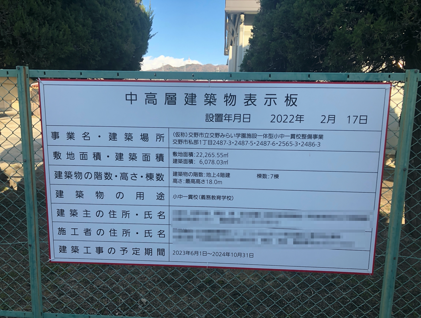 小中一貫校、交野小学校のフェンスに校舎建築の工事看板が登場してる!