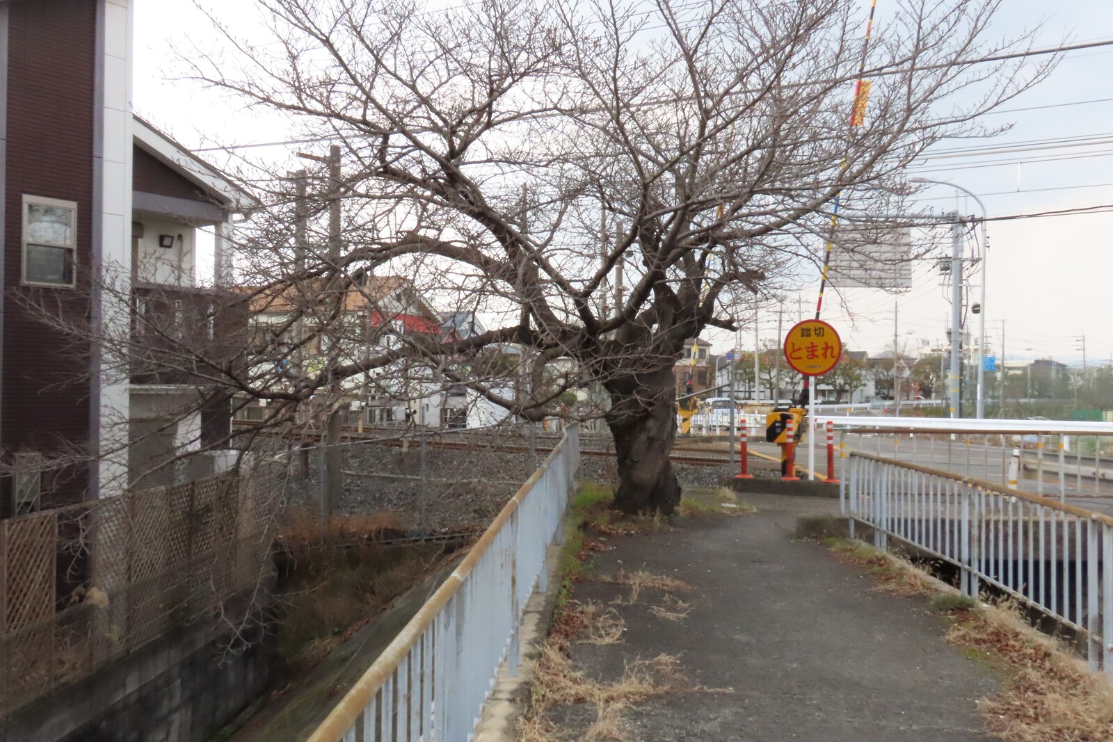 樹齢を重ねた桜の木が遮断機横に鎮座していますが、鉄道線路建築限界や、車道や歩道そして川越しの住宅に迫ると枝打ちされて、肩身が狭そうです。