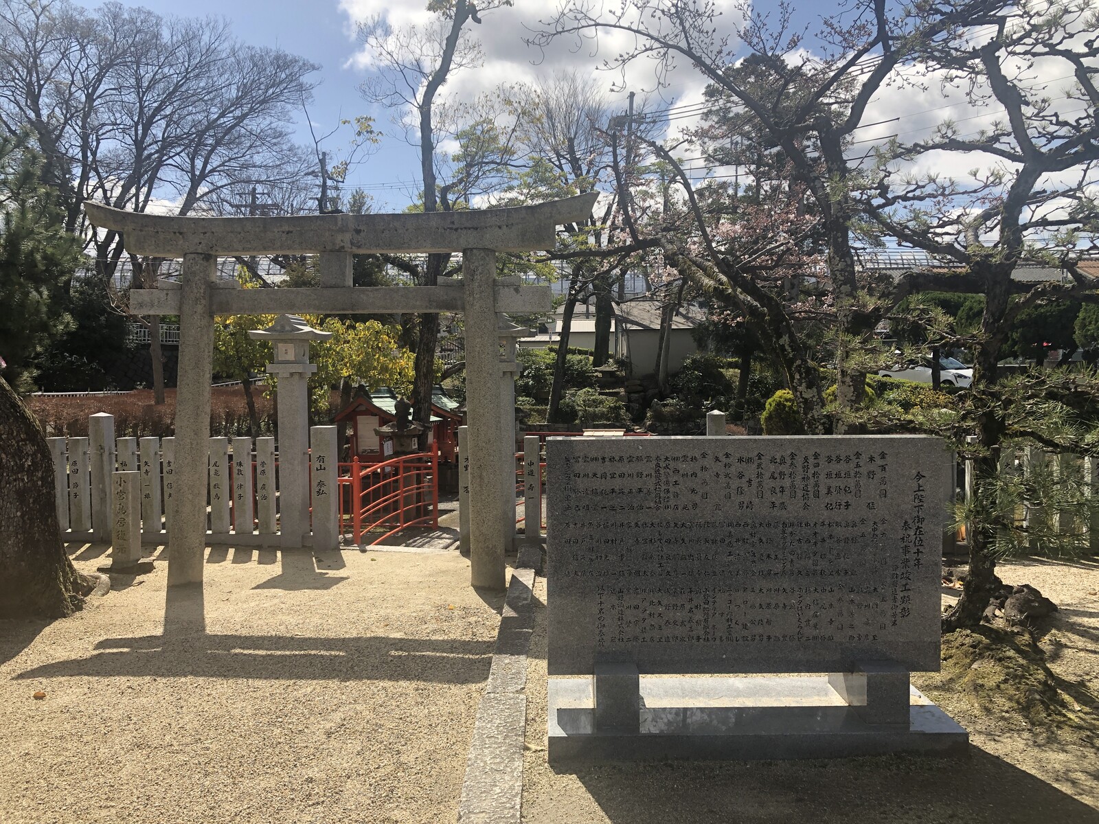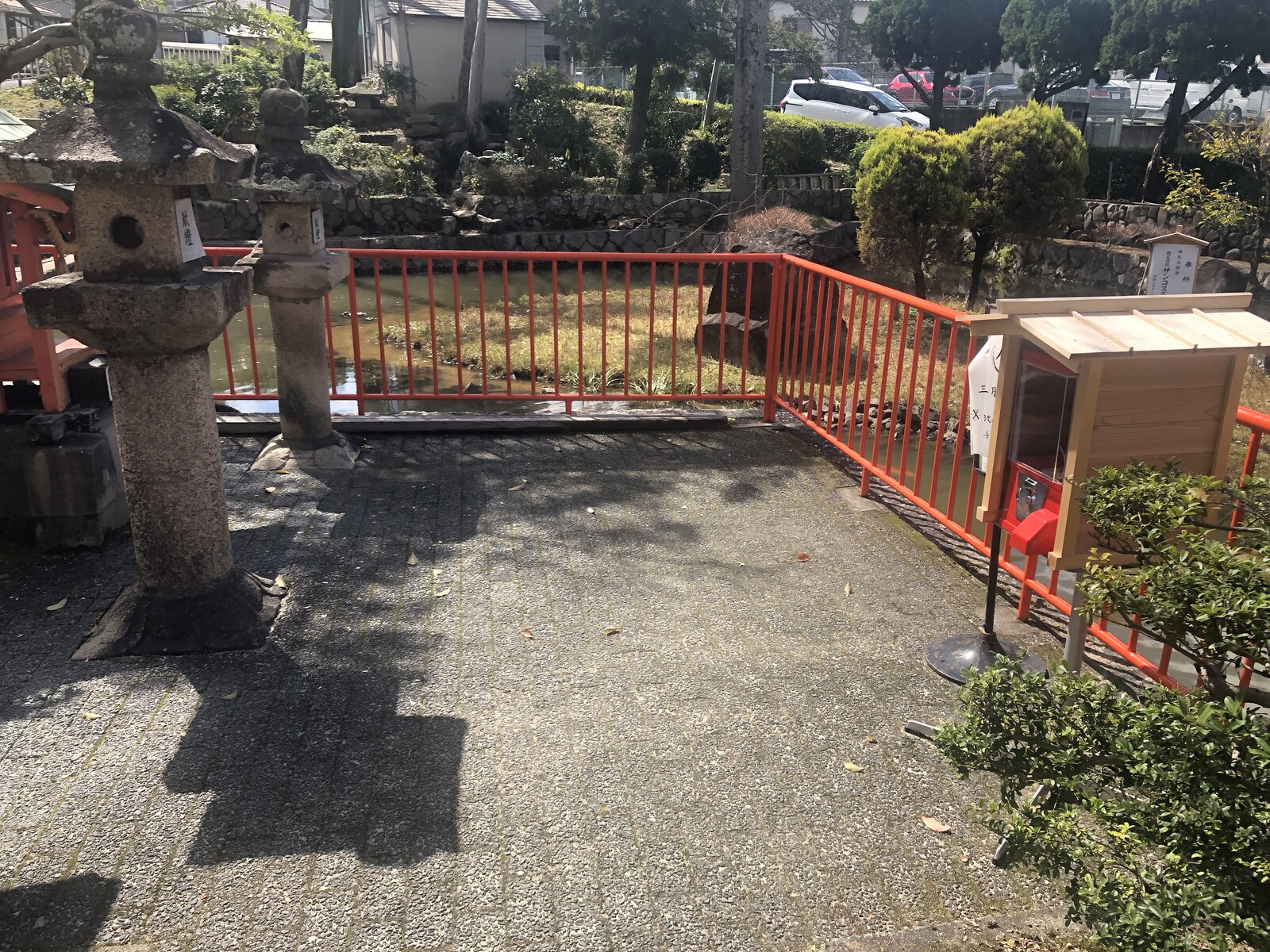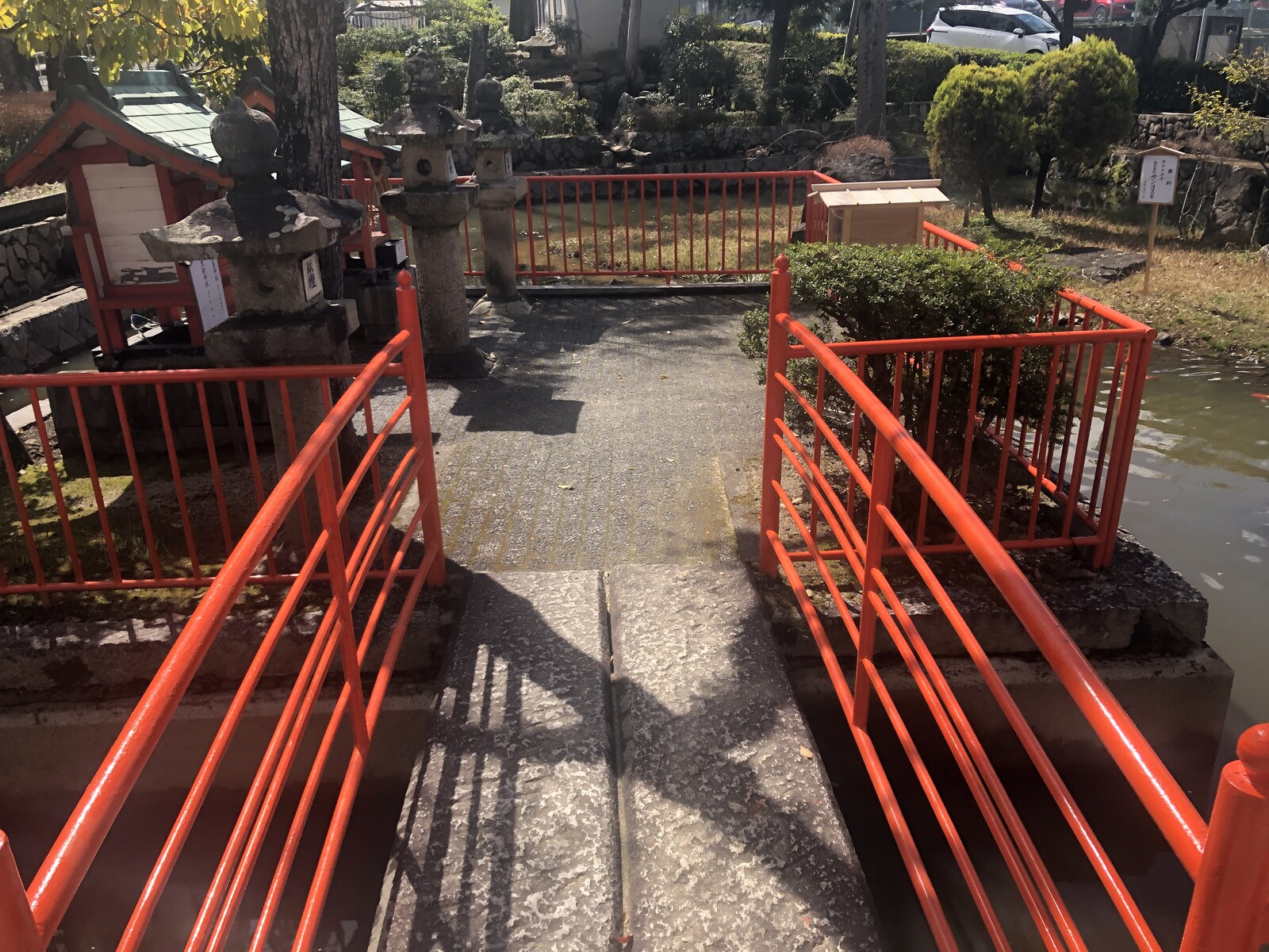 小さな鳥居と小さな赤い橋があるところ。