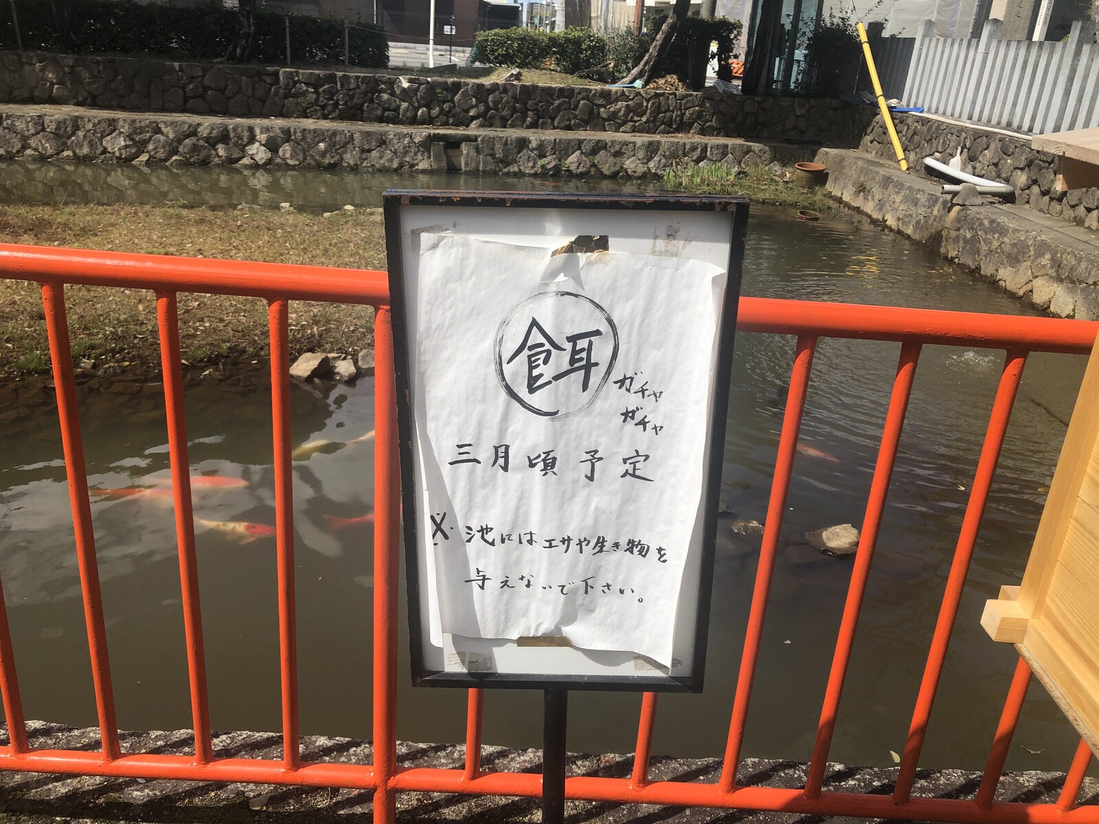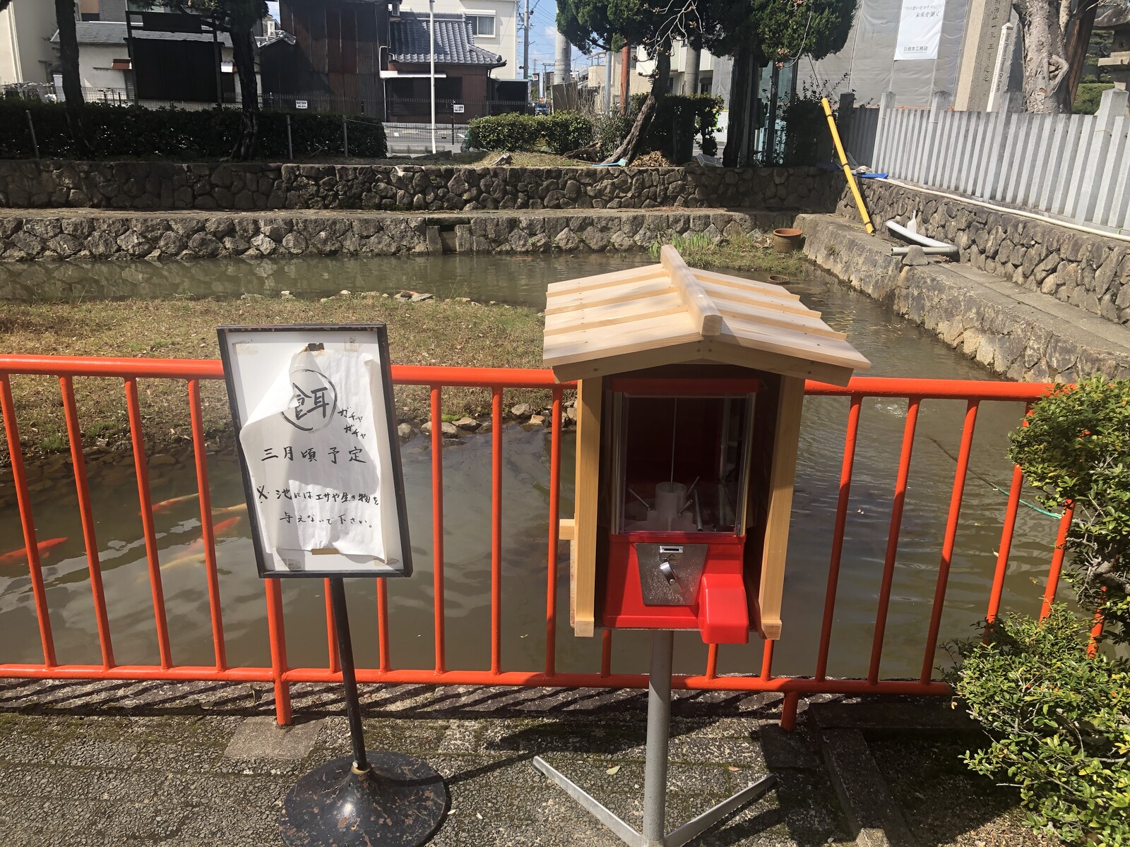 池には鯉が泳いでいたので、この餌ガチャガチャは主に鯉の餌ということなのかな?と思います。
