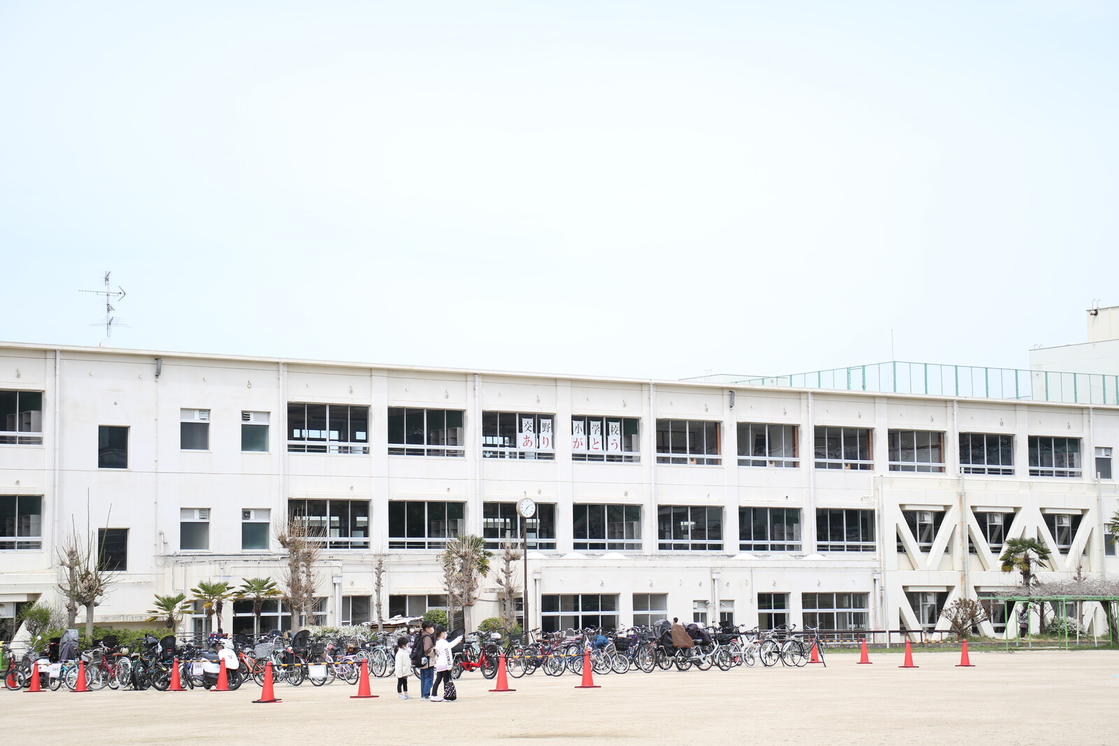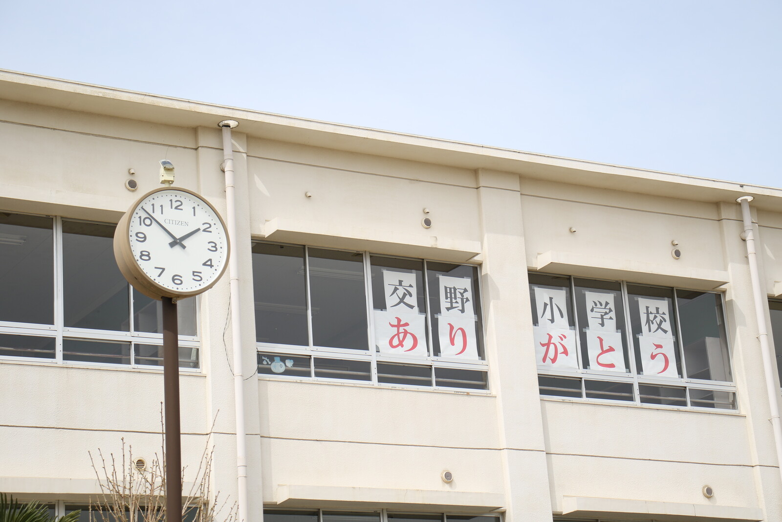 校舎に張り出された「交野小学校 ありがとう」の文字。