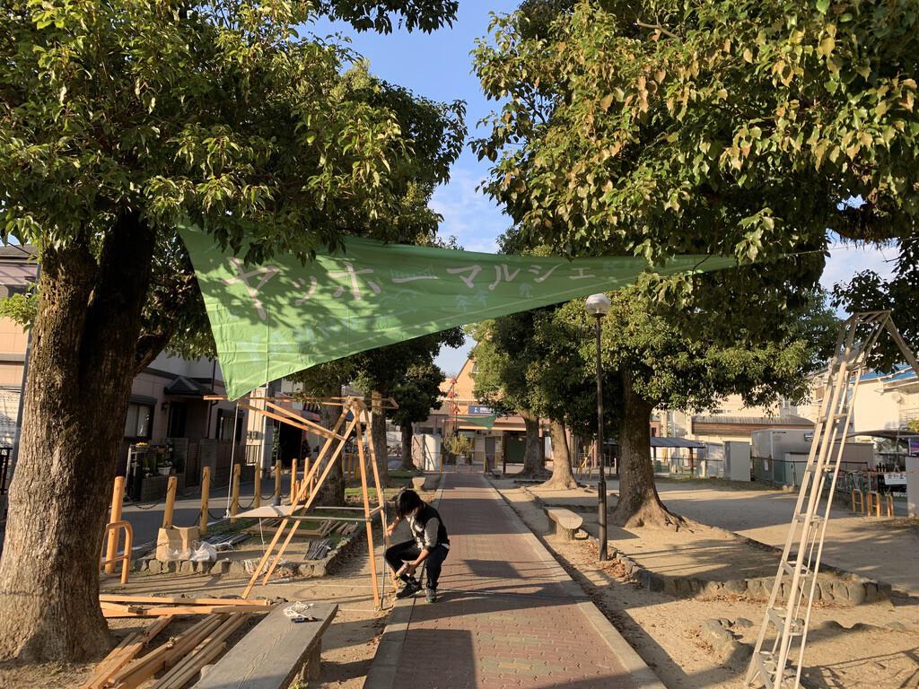 ↑こちらは、2020年の秋のヤッホーマルシェ開催で、設営時の駅前広場の様子です。