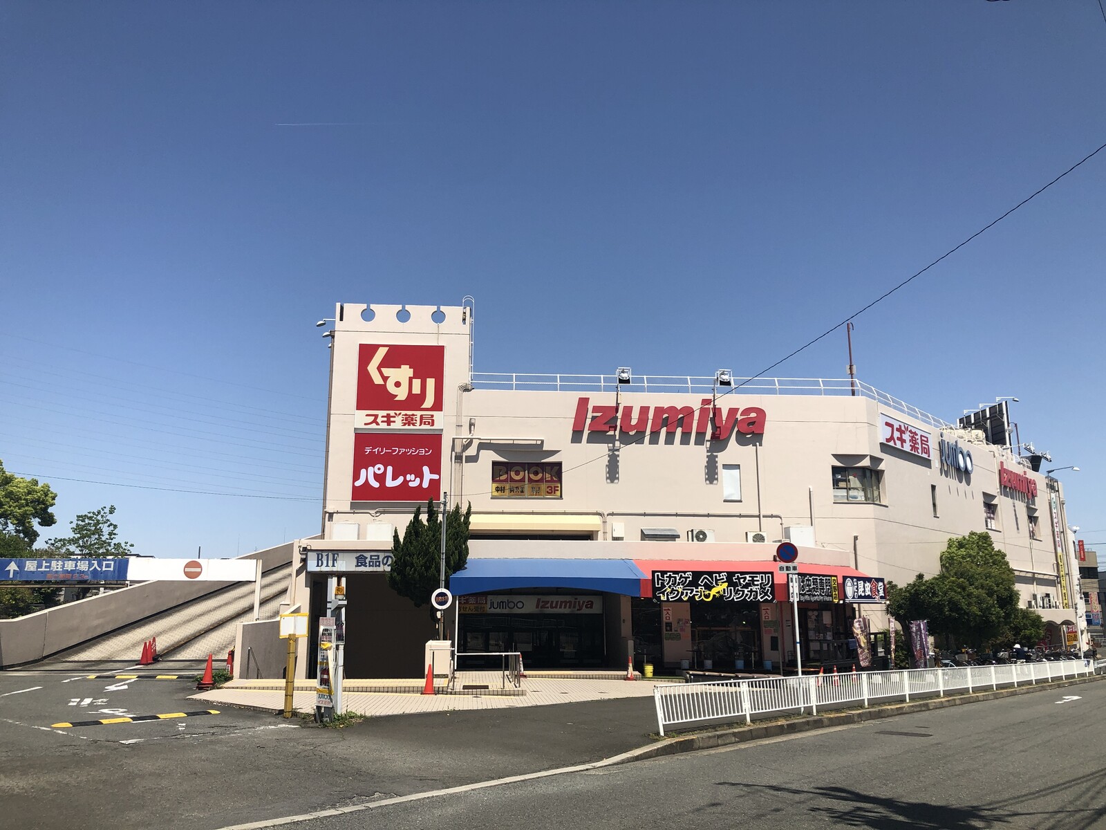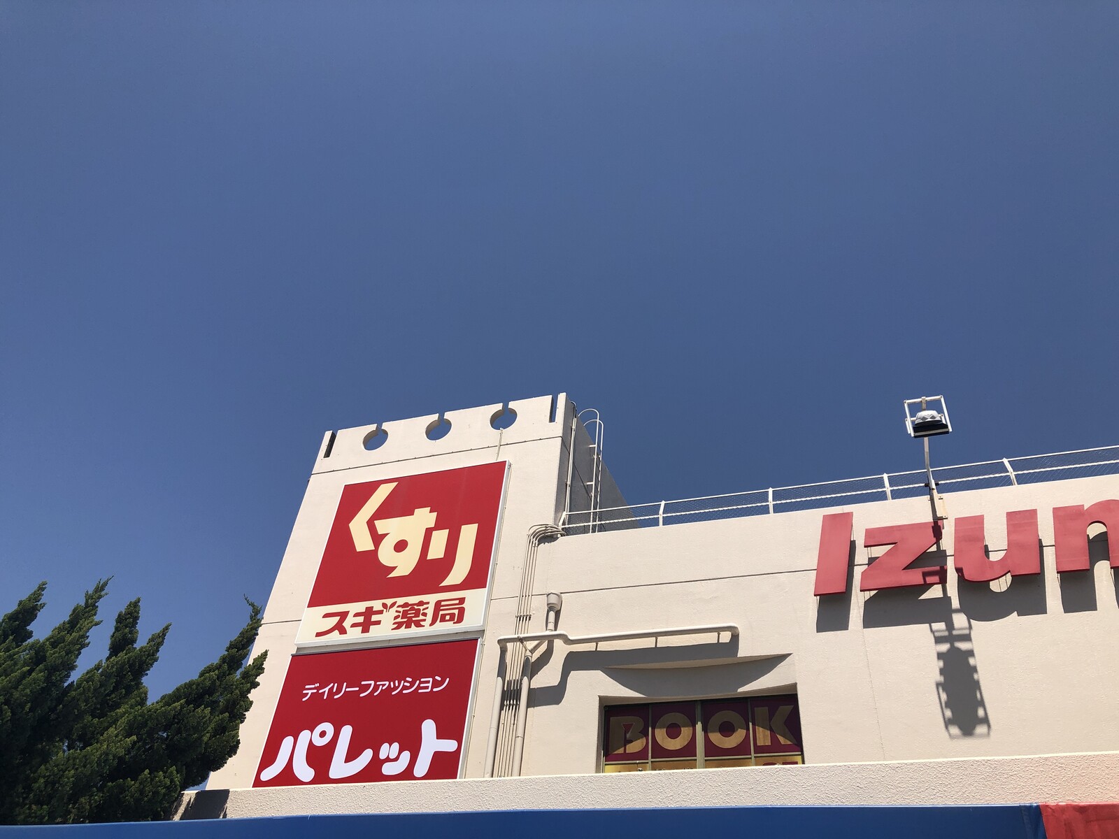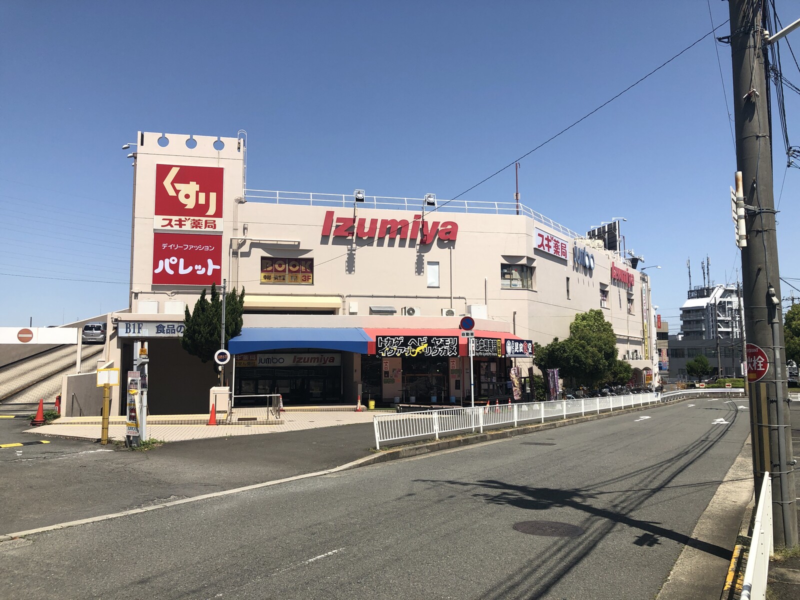 さらにIzumiyaの文字とスギ薬局、パレットの看板がどれも赤色なので、この一角だけめっちゃ赤色。