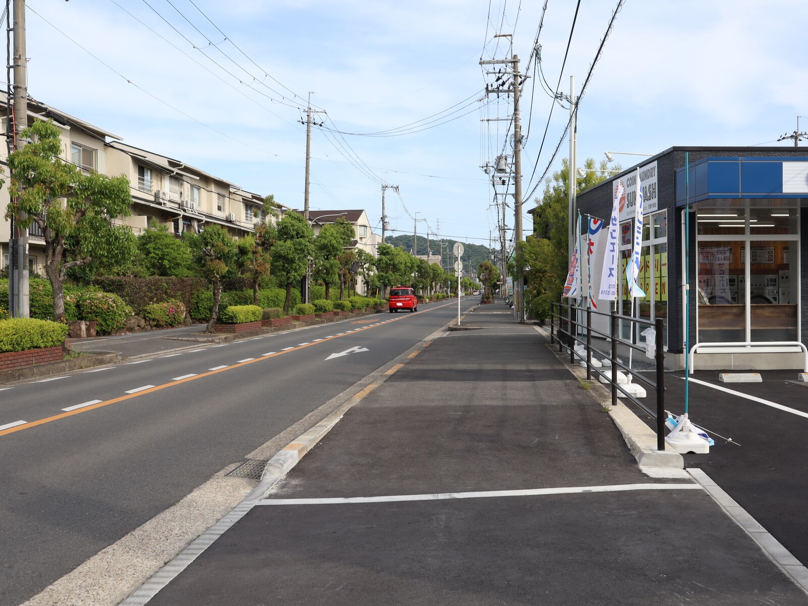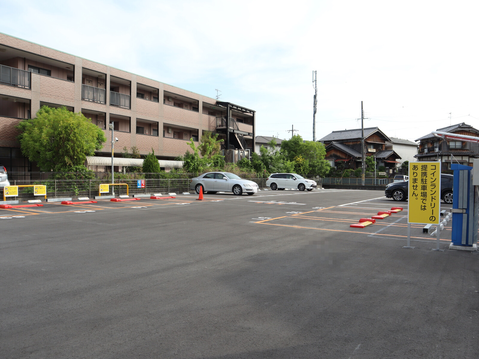 サンウォッシュの駐車場は建物の前にある3台分のみで、中の方へ入るとコインパーキングとマンションの駐車場になっています。