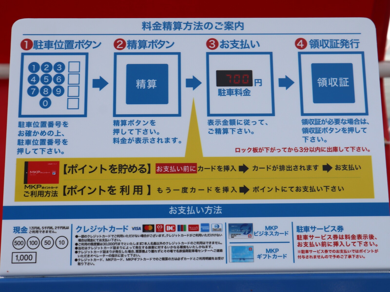 精算機のすぐ近くにはご利用方法や注意事項などが描かれた大きな看板があります。